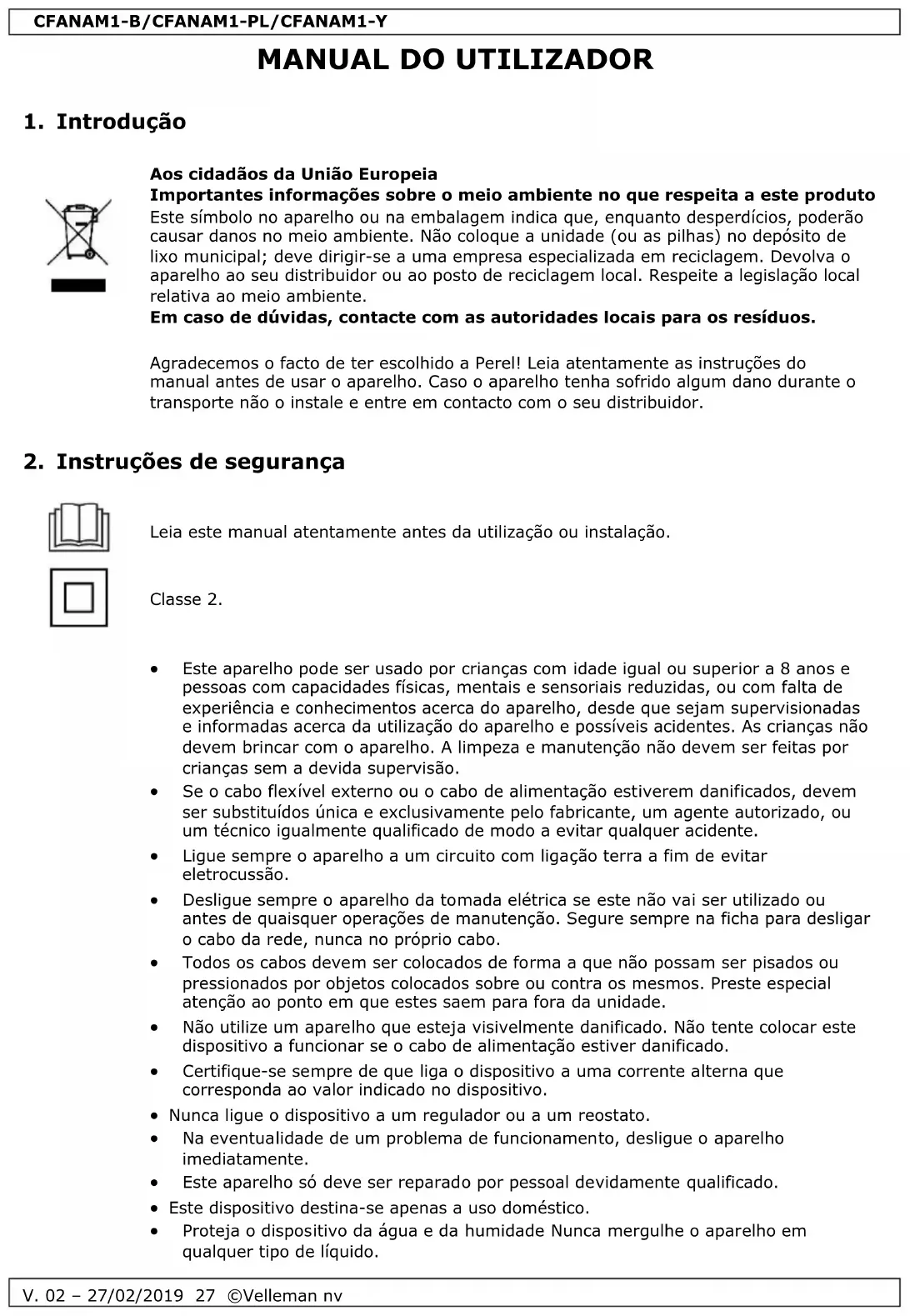 Utilize este aparelho apenas com acessórios originais. A Velleman NV não será responsável por quaisquer danos ou lesões causados pelo uso (indevido) do aparelho. Para mais informação sobre este produto e para aceder à versão mais recente deste manual do utilizador, visite a nossa página www.perel.eu. Podem alterar-se as especificações e o conteúdo deste manual sem aviso prévio.