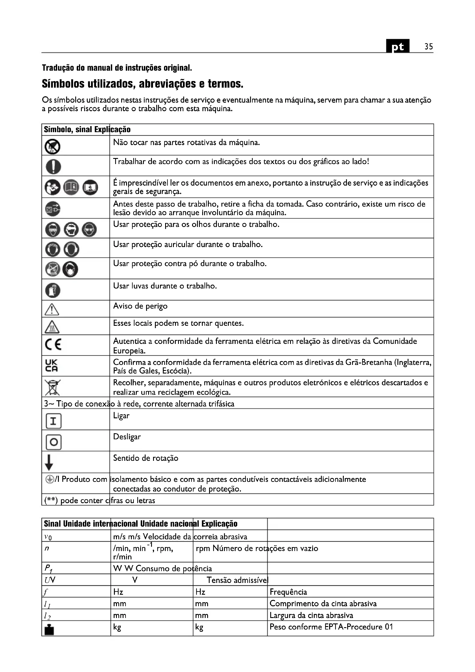 Tradução do manual de instruções original. Símbolos utilizados, abreviações e termos. Os símbolos utilizados nestas instruções de serviço e eventualmente na máquina, servem para chamar a sua atenção a possíveis riscos durante o trabalho com esta máquina. Símbolo, sinal Explicação Não tocar nas partes rotativas da máquina. Trabalhar de acordo com as indicações dos textos ou dos gráficos ao lado! É imprescindível ler os documentos em anexo, portanto a instrução de serviço e as indicações gerais de segurança. Antes deste passo de trabalho, retire a ficha da tomada. Caso contrário, existe um risco de lesão devido ao arranque involuntário da máquina. Usar proteção para os olhos durante o trabalho. Usar proteção auricular durante o trabalho. Usar proteção contra pó durante o trabalho. Usar luvas durante o trabalho. Aviso de perigo Esses locais podem se tornar quentes. Autentica a conformidade da ferramenta elétrica em relação às diretivas da Comunidade Europeia. Confirma a conformidade da ferramenta elétrica com as diretivas da Grã-Bretanha (Inglaterra, País de Gales, Escócia). Recolher, separadamente, máquinas e outros produtos eletrónicos e elétricos descartados e realizar uma reciclagem ecológica. 3~ Tipo de conexão à rede, corrente alternada trifásica Ligar Desligar Sentido de rotação /I Produto com isolamento básico e com as partes condutíveis contactáveis adicionalmente conectadas ao condutor de proteção. (**) pode conter cifras ou letras Sinal Unidade internacional Unidade nacional Explicação