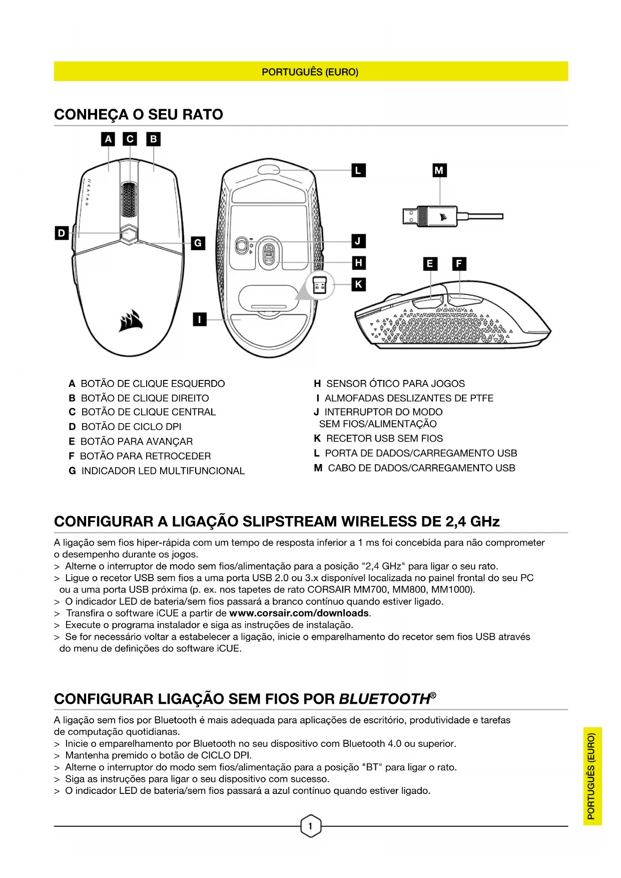 CONFIGURAR A LIGAÇÃO SLIPSTREAM WIRELESS DE 2,4GHz A ligação sem fios hiper-rápida com um tempo de resposta inferior a 1ms foi concebida para não comprometer o desempenho durante os jogos. > Alterne o interruptor de modo sem fios/alimentação para a posição "2,4GHz" para ligar o seu rato. > Ligue o recetor USB sem fios a uma porta USB2.0 ou 3.x disponível localizada no painel frontal do seu PC ou a uma porta USB próxima (p. ex. nos tapetes de rato CORSAIR MM700, MM800, MM1000). > O indicador LED de bateria/sem fios passará a branco contínuo quando estiver ligado. > Transfira o software iCUE a partir de www.corsair.com/downloads. > Execute o programa instalador e siga as instruções de instalação. > Se for necessário voltar a estabelecer a ligação, inicie o emparelhamento do recetor sem fios USB através do menu de definições do software iCUE. CONFIGURAR LIGAÇÃO SEM FIOS POR BLUETOOTH
