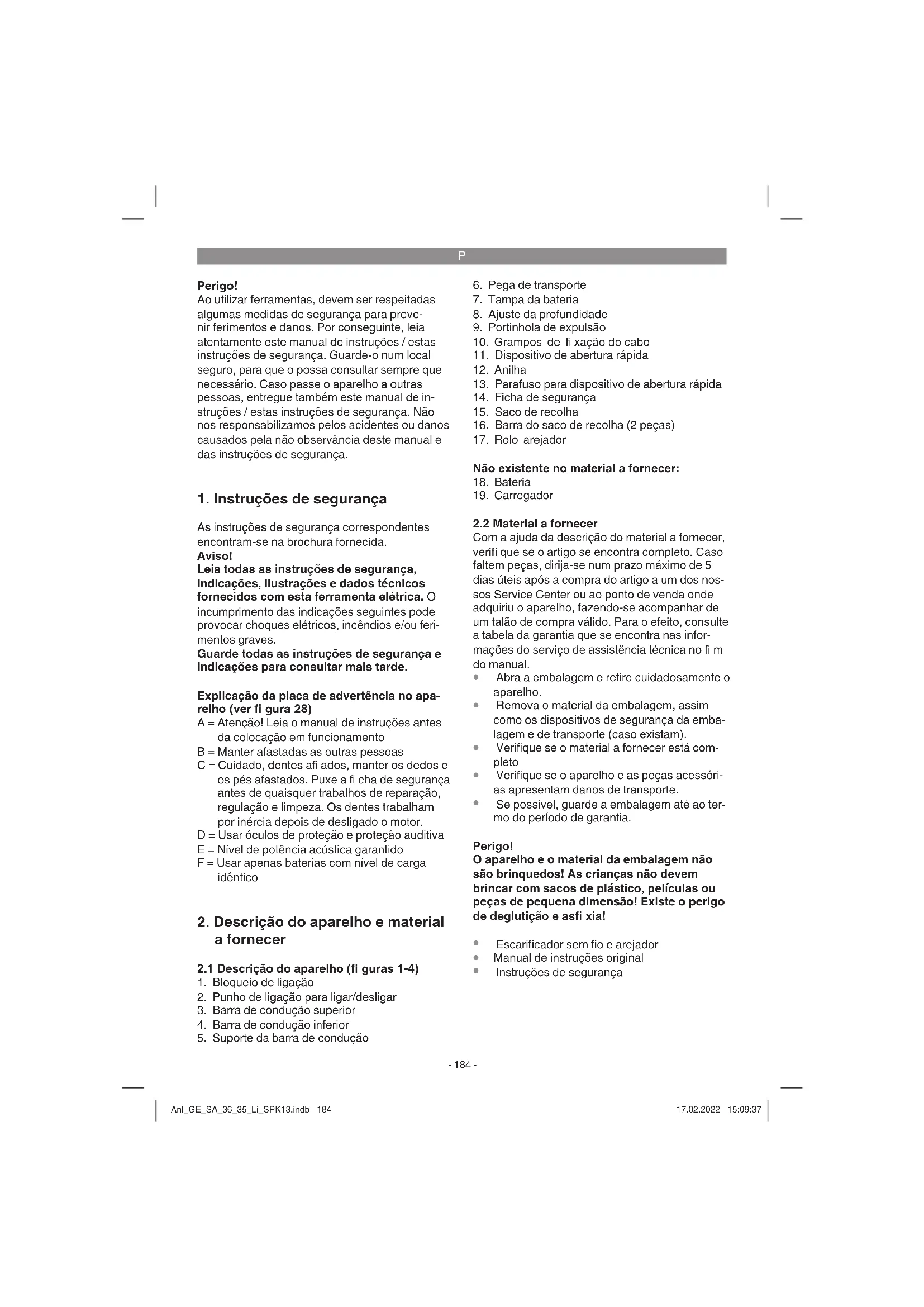 Grau de proteção: ........................................IPX1 Peso .........................................................10,6 kg Perigo! Ruído e vibração Os valores de ruído e de vibração foram medidos de acordo com as normas EN ISO 3744, EN ISO 11201, ISO 11094 e EN ISO 20643. Atenção! O aparelho é fornecido sem baterias nem carre- gador e só pode ser usado com as baterias de lítio da série Power X-Change! As baterias de lítio da série Power X-Change só podem ser carregadas com o carregador Power X-Charger. Anl_GE_SA_36_35_Li_SPK13.indb 185Anl_GE_SA_36_35_Li_SPK13.indb 185 17.02.2022 15:09:3717.02.2022 15:09:37P