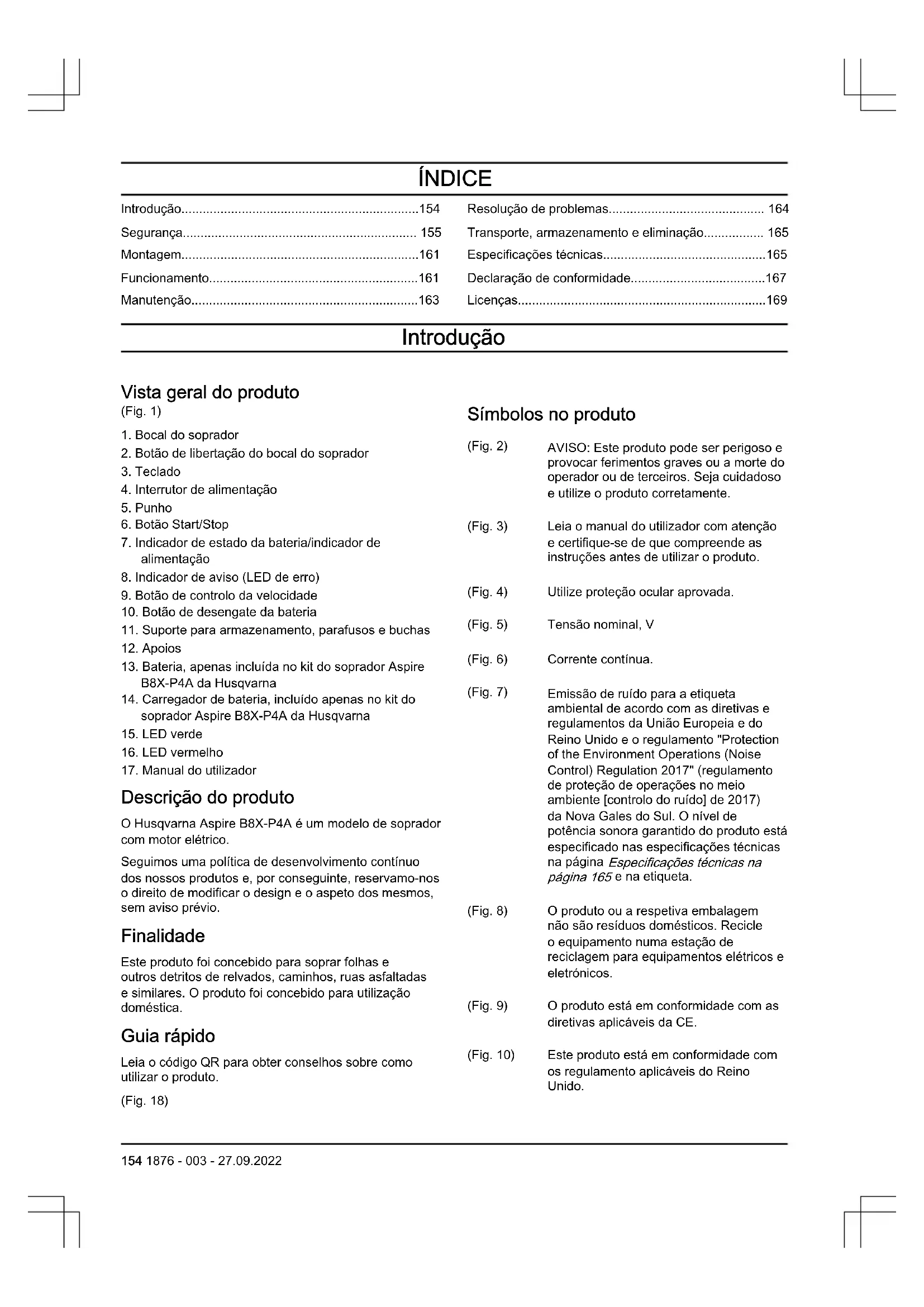 Descrição do produto O Husqvarna Aspire B8X-P4A é um modelo de soprador com motor elétrico. Seguimos uma política de desenvolvimento contínuo dos nossos produtos e, por conseguinte, reservamo-nos o direito de modificar o design e o aspeto dos mesmos, sem aviso prévio. Finalidade Este produto foi concebido para soprar folhas e outros detritos de relvados, caminhos, ruas asfaltadas e similares. O produto foi concebido para utilização doméstica. Guia rápido Leia o código QR para obter conselhos sobre como utilizar o produto. (Fig. 18) Símbolos no produto (Fig. 2) AVISO: Este produto pode ser perigoso e provocar ferimentos graves ou a morte do operador ou de terceiros. Seja cuidadoso e utilize o produto corretamente. (Fig. 3) Leia o manual do utilizador com atenção e certifique-se de que compreende as instruções antes de utilizar o produto. (Fig. 4) Utilize proteção ocular aprovada. (Fig. 5) Tensão nominal, V (Fig. 6) Corrente contínua. (Fig. 7) Emissão de ruído para a etiqueta ambiental de acordo com as diretivas e regulamentos da União Europeia e do Reino Unido e o regulamento "Protection of the Environment Operations (Noise Control) Regulation 2017" (regulamento de proteção de operações no meio ambiente [controlo do ruído] de 2017) da Nova Gales do Sul. O nível de potência sonora garantido do produto está especificado nas especificações técnicas na página Especificações técnicas na página 165 e na etiqueta. (Fig. 8) O produto ou a respetiva embalagem não são resíduos domésticos. Recicle o equipamento numa estação de reciclagem para equipamentos elétricos e eletrónicos. (Fig. 9) O produto está em conformidade com as diretivas aplicáveis da CE. (Fig. 10) Este produto está em conformidade com os regulamento aplicáveis do Reino Unido. 154 1876 - 003 - 27.09.2022(Fig. 11) Não exponha à chuva. (Fig. 15) O utilizador do soprador tem de se certificar de que não se encontra qual- quer pessoa ou animal num raio de 15metros. Se trabalharem vários utili- zadores simultaneamente na mesma área, deve existir uma distância de se- gurança de, pelo menos, 15metros. O soprador pode arremessar violenta- mente objetos que podem fazer rico- chete. Isso pode levar a graves lesões nos olhos no caso do equipamento de segurança recomendado não ser usa- do. aaaa ssxxxxx A etiqueta de tipo apresenta o número de série. aaaa é o ano de fabrico, ss é a semana de fabrico. Nota: Os restantes símbolos/autocolantes existentes no produto dizem respeito a exigências específicas para homologação em alguns países. Símbolos na bateria e/ou no carregador de bateria (Fig. 16) Recicle este produto numa estação de re- ciclagem para equi- pamentos elétricos e eletrónicos. (Válido unicamente na Euro- pa) (Fig. 17) Utilize a bateria ape- nas em produtos de parceiros do sistema POWER FOR ALL. (Fig. 12) Transformador contra-falhas. (Fig. 13) Utilize e armazene o carregador de bateria apenas em espaços interiores. (Fig. 14) Isolamento duplo. Responsabilidade pelo produto Como referido nas leis de responsabilidade pelo produto, não somos responsáveis por danos causados pelo nosso produto se:
