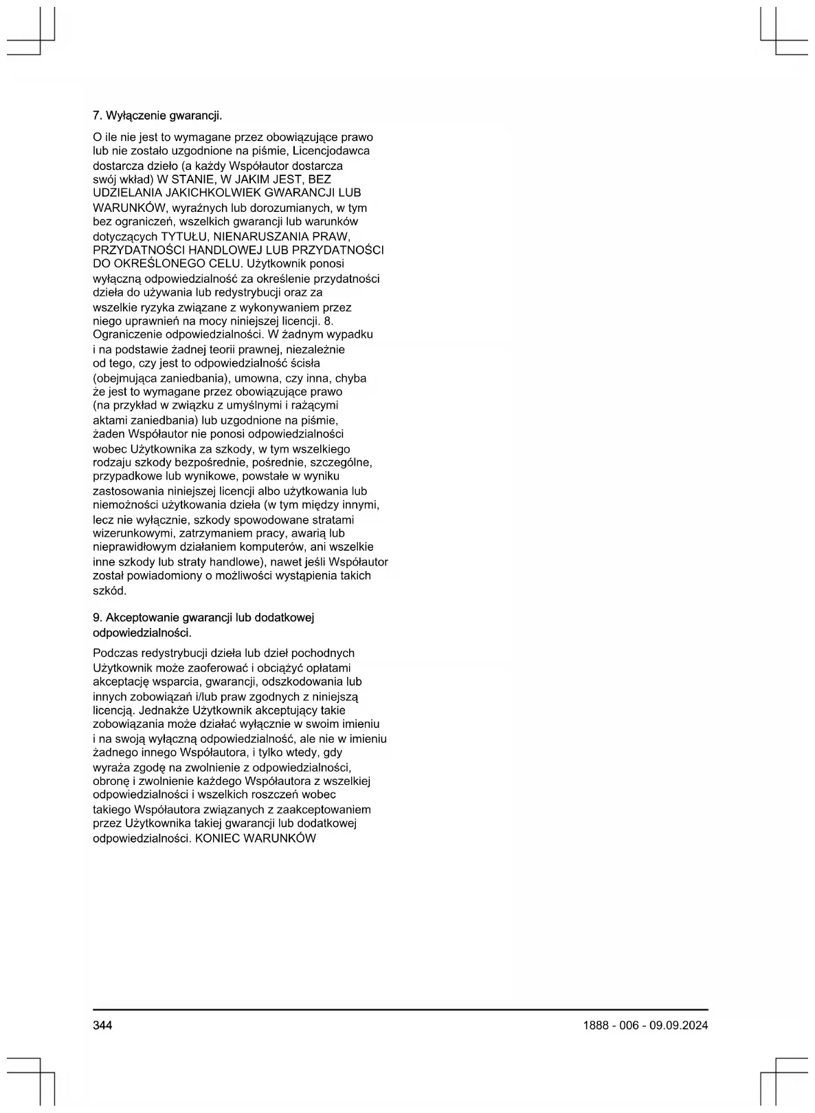 Salvo se exigido pela lei aplicável ou acordado por escrito, o Licenciante fornece o Trabalho (e cada Colaborador fornece as suas Contribuições) num formato "TAL COMO ESTÁ", SEM GARANTIAS OU CONDIÇÕES DE QUALQUER TIPO, expressas ou implícitas, incluindo, sem limitação, quaisquer garantias ou condições de TÍTULO, NÃO VIOLAÇÃO, COMERCIALIZAÇÃO ou ADEQUAÇÃO A UM DETERMINADO FIM. O Utilizador é o único responsável por determinar a adequação de utilizar 1888 - 006 - 09.09.2024 363ou redistribuir o Trabalho e assumir quaisquer riscos associados ao seu exercício de permissões ao abrigo desta Licença. 8. Limitação de responsabilidade. Em circunstância alguma e sob nenhuma teoria legal, quer seja por delito (incluindo negligência), contrato ou outra, a menos que exigido pela lei aplicável (tal como atos deliberados e grosseiramente negligentes) ou acordado por escrito, qualquer Colaborador será responsável perante o Utilizador por danos, incluindo quaisquer danos diretos, indiretos, especiais, incidentais ou consequenciais de qualquer natureza resultantes da presente Licença ou da utilização ou incapacidade de utilização do Trabalho (incluindo, entre outros, danos por perda de reputação, interrupção do trabalho, falha ou avaria do computador ou quaisquer outros danos ou perdas comerciais), mesmo que tal Colaborador tenha sido informado da possibilidade de tais danos.