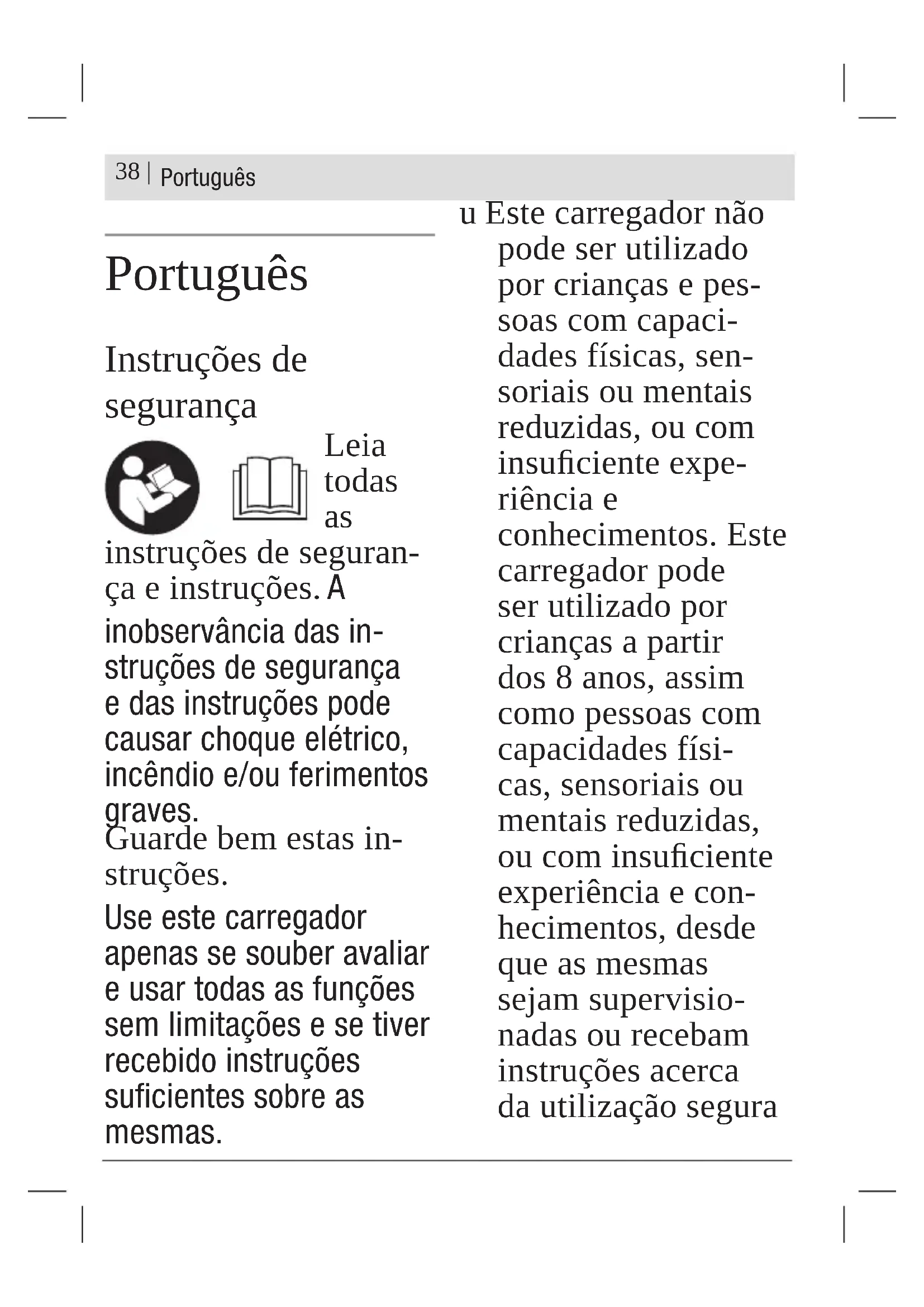 depende da temperatura e do tipo de bateria Português42 | Processo de carrega- mento u Observar a tensão de rede! A tensão da fonte de corrente deve coincidir com a chapa de identificação do carregador. Certifique-se de que o compartimento de carga (3) e os contactos da bateria estão livres de sujidade maior. Certifique-se de que a bateria está totalmente inserida. O processo de carga termina, assim que a ficha de rede do carregador estiver inserido na tomada e a bateria no compartimento de carga (3). O processo de carga só é possível se a tempera- tura da bateria se encontrar na faixa de temperatu- ra de carregamento permitida (0–45 °C). Graças ao processo de carga inteligente, o nível de carga da bateria é detetado automatica- mente e a bateria é carregada sempre com a corrente de carga ideal independentemente da temperatura e da tensão da bateria. Desta forma, a bateria é poupada e permanece completamente carregada quando armazenada no carregador. Um tempo de funcionamento reduzido após o carregamento indica que a bateria está gasta e que deve ser substituída. No caso de contínuos e repetidos ciclos de carga, sem interrupção, é possível que o carregador se esquente. No entanto, isso é seguro e não indica um defeito técnico do carregador. Tempos de carga Na seguinte tabela pode consultar o tempo aproximado necessário em minutos para o nível de carga desejado, em função do tipo de bateria. O tem- po de carga depende do tipo de bateria e da temperatura. Português| 43 P4A 18-C70 Baterias do sistema POWER FOR ALL de 18 V recarregáveis 1,5 Ah ≈24 ≈33 2,0 Ah ≈32 ≈45 2,5 Ah ≈40 ≈60 3,0 Ah ≈48 ≈72 4,0 Ah ≈64 ≈95 4,0 Ah Power Plus ≈69 ≈88 5,0 Ah ≈80 ≈105 6,0 Ah ≈96 ≈130 corresponde a um nível de carga de ≈ 80% corresponde a um nível de carga completo Significado dos ele- mentos de indicação Luz intermitente (rápida) indicador do nível de carga verde O processo de carregamento rápido é indicado pelo piscar rápido do indicador do nível de carga verde (2). A bateria pode ser retirada em qualquer altura e utilizada. Assim que for atingida 80% da capacidade da bateria, o piscar do indicador do nível de carga verde fica mais lento. O carregamento rápido está agora concluído. Se a bateria ficar no carregador, o processo de carga é terminado com velocidade reduzida. Luz intermitente (lenta) indicador do nível de carga verde Com um nível de carga da bateria de aprox. 80%, o indicador do nível de carga verde (2) pisca lentamente. A bateria pode ser retirada para uso imediato. Luz permanente verde do indicador do nível de carga da bateria A luz permanente verde do indicador do nível da carga (2) indica que a bateria está completamente carregada. Em seguida o acumulador pode ser colocado Português44 | imediatamente em funcionamen- to. Sem a bateria colocada, a luz permanente verde do indicador do nível da carga (2), indica que a ficha de rede está inserida na tomada e que o carregador está operacional. Luz permanente vermelha do indicador de monitorização de tempe- ratura A luz permanente vermelha do indicador (1) indica que a temperatura da bateria se encontra fora da faixa de temperatura de carga permitida (0–45 °C). O carregamento inicia-se assim que a faixa de temperatura permitida seja alcançada. Luz intermitente vermelha do indicador A luz intermitente vermelha do indicador (1) indica uma falha no processo de carga (ver „A bateria não é carregada“, Página 44). Eliminação de erros A bateria não é carregada A bateria não é carregada; a indicação vermelha (1) pisca e o indicador do nível de carga verde (2) acende de forma permanente. Causa: O carregador detetou um erro interno Solução: Certificar-se de que todas as baterias estão totalmente inseridas. Retire a ficha de alimentação e volte a introduzir. Se o erro ocorrer novamente, solicite a verificação do carregador a um centro de serviço de pós-venda para produ- tos Husqvarna. Causa: bateria inserida de forma incorreta Solução: insira a bateria correta- mente no carregador. Causa: contactos da bateria e de carregamento sujos Solução: limpe os contactos da Português| 45 bateria e de carregamento; p. ex. inserindo e removendo várias vezes a bateria. Causa: bateria danificada Solução: substitua a bateria. A bateria não é carregada e o indicador (1) está aceso a vermelho. Causa: temperatura da bateria fora da faixa de temperatura de carga admissível Solução: Esperar até que a tem- peratura da bateria esteja dentro da faixa de temperatura de carga admissível (0–45 °C). Os indicadores não acendem Nenhum indicador aceso, a bateria não é carregada. Causa: tomada, cabo de rede ou carregador com defeito Solução: verifique a tensão de rede. Se necessário, mande verificar o carregador num posto de assistência técnica autorizado. Causa: a ficha de rede do carre- gador não está (bem) inserida Solução: insira a ficha de rede (totalmente) na tomada. Eliminação Carregadores, acessórios e emba- lagens devem ser enviados a uma reciclagem ecológica de matéria-prima. Não deitar os carregadores no lixo doméstico! Apenas para países da UE: De acordo com a diretiva europeia 2012/19/UE para aparelhos elétricos e eletrónicos velhos, e com as respetivas realizações nas leis nacionais, os carregado- res que não servem mais para a utilização, devem ser enviadas separadamente a uma reciclagem ecológica. No caso de uma eliminação incorreta, os aparelhos elétricos e eletrónicos antigos podem ter efeitos nocivos no ambiente e na saúda humada devido à possível presença de substâncias perigo- sas. Português46 | Italiano Avvertenze di sicurezza Leg- gere tutte le avvertenze e dispo- sizioni di sicurezza. La mancata osservanza delle avvertenze e dispo- sizioni di sicurezza può causare folgorazioni, incendi e/o lesioni di grave entità. Custodire accurata- mente le presenti istru- zioni. Utilizzare la stazi