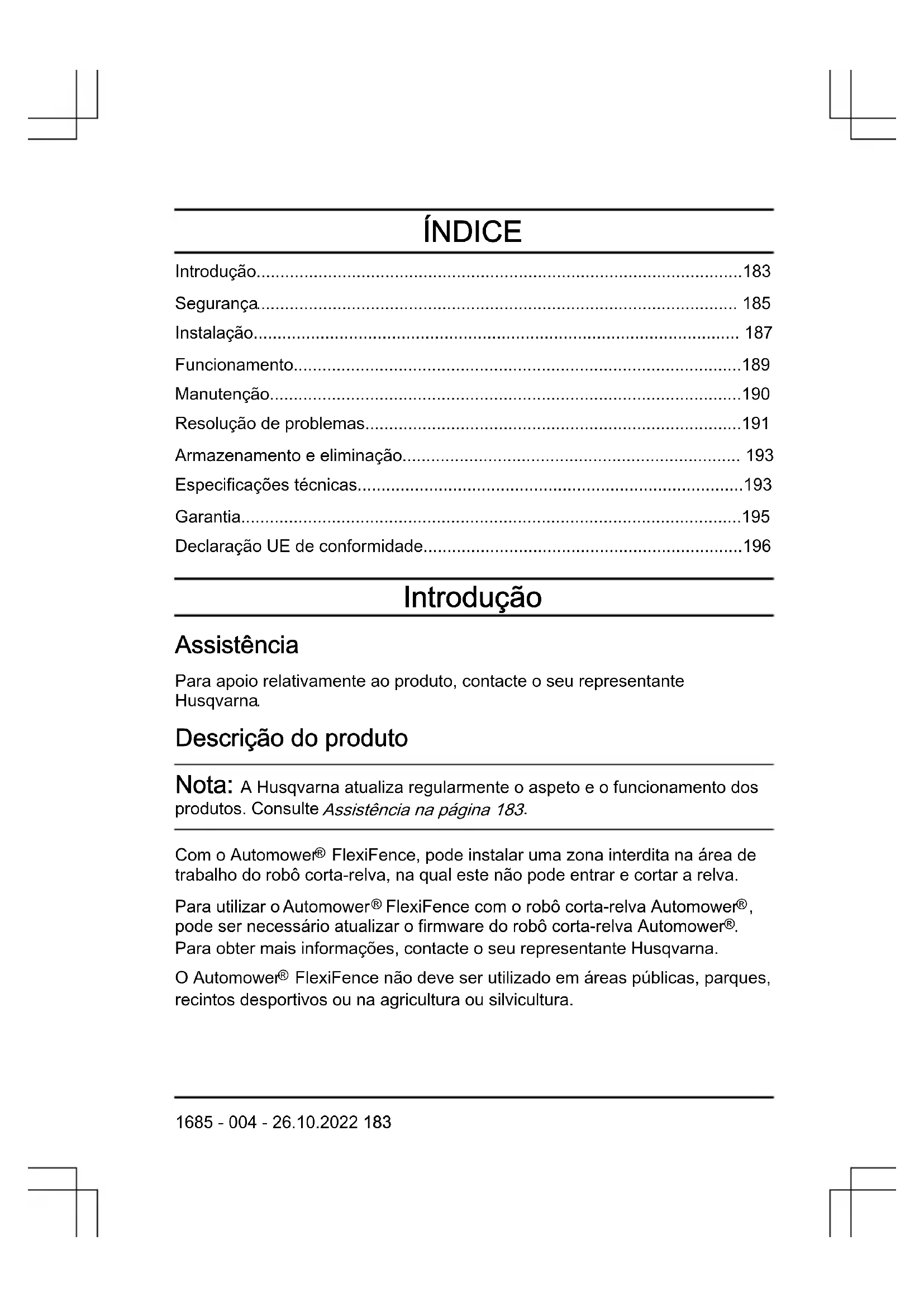 - Declaração UE de conformidade Introdução Assistência Para apoio relativamente ao produto, contacte o seu representante Husqvarna p. 196