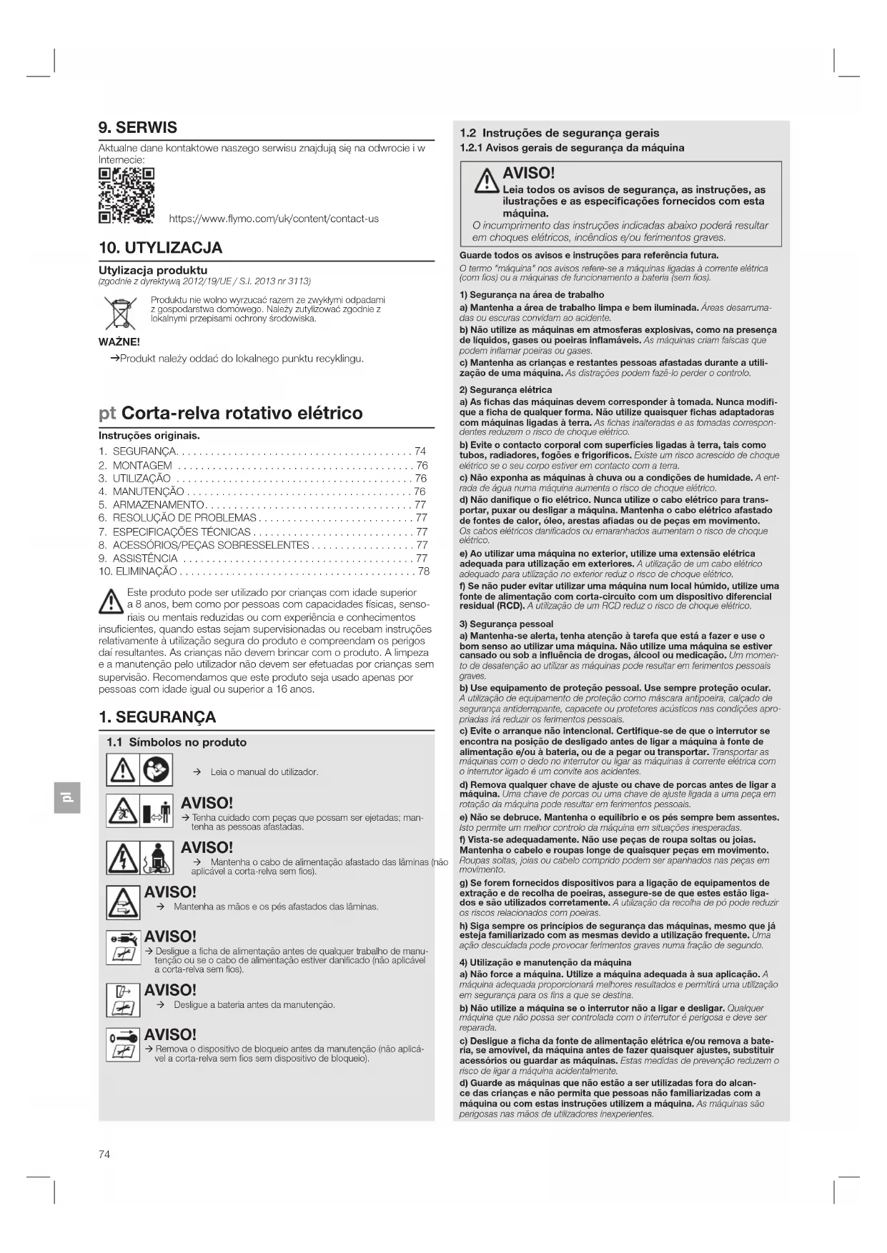 AVISO! Leia todos os avisos de segurança, as instruções, as ilustrações e as especicações fornecidos com esta máquina. O incumprimento das instruções indicadas abaixo poderá resultar em choques elétricos, incêndios e/ou ferimentos graves. Guarde todos os avisos e instruções para referência futura.O termo "máquina" nos avisos refere-se a máquinas ligadas à corrente elétrica (com os) ou a máquinas de funcionamento a bateria (sem os).1) Segurança na área de trabalhoa) Mantenha a área de trabalho limpa e bem iluminada. Áreas desarruma-das ou escuras convidam ao acidente.b) Não utilize as máquinas em atmosferas explosivas, como na presença de líquidos, gases ou poeiras inamáveis. As máquinas criam faíscas que podem inamar poeiras ou gases.c) Mantenha as crianças e restantes pessoas afastadas durante a utili-zação de uma máquina. As distrações podem fazê-lo perder o controlo.2) Segurança elétricaa) As chas das máquinas devem corresponder à tomada. Nunca modi-que a cha de qualquer forma. Não utilize quaisquer chas adaptadoras com máquinas ligadas à terra. As chas inalteradas e as tomadas correspon- dentes reduzem o risco de choque elétrico.b) Evite o contacto corporal com superfícies ligadas à terra, tais como tubos, radiadores, fogões e frigorícos. Existe um risco acrescido de choque elétrico se o seu corpo estiver em contacto com a terra.c) Não exponha as máquinas à chuva ou a condições de humidade. A ent-rada de água numa máquina aumenta o risco de choque elétrico.d) Não danique o o elétrico. Nunca utilize o cabo elétrico para trans-portar, puxar ou desligar a máquina. Mantenha o cabo elétrico afastado de fontes de calor, óleo, arestas aadas ou de peças em movimento. Os cabos elétricos danicados ou emaranhados aumentam o risco de choque elétrico.e) Ao utilizar uma máquina no exterior, utilize uma extensão elétrica adequada para utilização em exteriores. A utilização de um cabo elétrico adequado para utilização no exterior reduz o risco de choque elétrico.f) Se não puder evitar utilizar uma máquina num local húmido, utilize uma fonte de alimentação com corta-circuito com um dispositivo diferencial residual (RCD). A utilização de um RCD reduz o risco de choque elétrico.3) Segurança pessoala) Mantenha-se alerta, tenha atenção à tarefa que está a fazer e use o bom senso ao utilizar uma máquina. Não utilize uma máquina se estiver cansado ou sob a inuência de drogas, álcool ou medicação. Um momen-to de desatenção ao utilizar as máquinas pode resultar em ferimentos pessoais graves.b) Use equipamento de proteção pessoal. Use sempre proteção ocular. A utilização de equipamento de proteção como máscara antipoeira, calçado de segurança antiderrapante, capacete ou protetores acústicos nas condições apro-priadas irá reduzir os ferimentos pessoais.c) Evite o arranque não intencional. Certique-se de que o interrutor se encontra na posição de desligado antes de ligar a máquina à fonte de alimentação e/ou à bateria, ou de a pegar ou transportar. Transportar as máquinas com o dedo no interrutor ou ligar as máquinas à corrente elétrica com o interrutor ligado é um convite aos acidentes.d) Remova qualquer chave de ajuste ou chave de porcas antes de ligar a máquina. Uma chave de porcas ou uma chave de ajuste ligada a uma peça em rotação da máquina pode resultar em ferimentos pessoais.e) Não se debruce. Mantenha o equilíbrio e os pés sempre bem assentes. Isto permite um melhor controlo da máquina em situações inesperadas.f) Vista-se adequadamente. Não use peças de roupa soltas ou joias. Mantenha o cabelo e roupas longe de quaisquer peças em movimento. Roupas soltas, joias ou cabelo comprido podem ser apanhados nas peças em movimento.g) Se forem fornecidos dispositivos para a ligação de equipamentos de extração e de recolha de poeiras, assegure-se de que estes estão liga-dos e são utilizados corretamente. A utilização da recolha de pó pode reduzir os riscos relacionados com poeiras.h) Siga sempre os princípios de segurança das máquinas, mesmo que já esteja familiarizado com as mesmas devido a utilização frequente. Uma ação descuidada pode provocar ferimentos graves numa fração de segundo.4) Utilização e manutenção da máquinaa) Não force a máquina. Utilize a máquina adequada à sua aplicação. A máquina adequada proporcionará melhores resultados e permitirá uma utilização em segurança para os ns a que se destina.b) Não utilize a máquina se o interrutor não a ligar e desligar. Qualquer máquina que não possa ser controlada com o interrutor é perigosa e deve ser reparada.c) Desligue a cha da fonte de alimentação elétrica e/ou remova a bate-ria, se amovível, da máquina antes de fazer quaisquer ajustes, substituir acessórios ou guardar as máquinas. Estas medidas de prevenção reduzem o risco de ligar a máquina acidentalmente.d) Guarde as máquinas que não estão a ser utilizadas fora do alcan-ce das crianças e não permita que pessoas não familiarizadas com a máquina ou com estas instruções utilizem a máquina. As máquinas são perigosas nas mãos de utilizadores inexperientes. pt Corta-relva rotativo elétrico Instruções originais. Este produto pode ser utilizado por crianças com idade superior a 8anos, bem como por pessoas com capacidades físicas, senso- riais ou mentais reduzidas ou com experiência e conhecimentos insucientes, quando estas sejam supervisionadas ou recebam instruções relativamente à utilização segura do produto e compreendam os perigos daí resultantes. As crianças não devem brincar com o produto. A limpeza e a manutenção pelo utilizador não devem ser efetuadas por crianças sem supervisão. Recomendamos que este produto seja usado apenas por pessoas com idade igual ou superior a 16 anos.