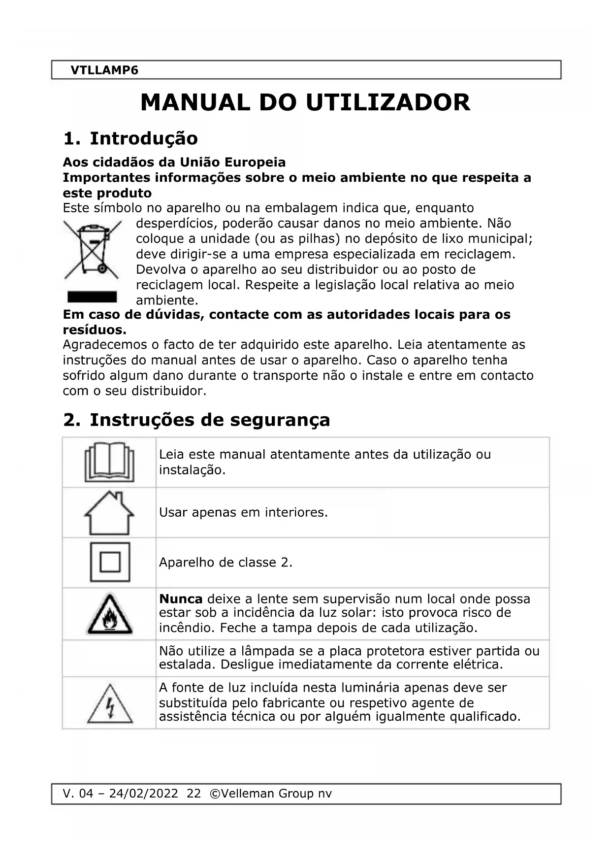 Baixe as instruções para o seu Lâmpada em formato PDF gratuitamente! Encontre o seu manual VTLLAMP6 - VELLEMAN e retome o controlo do seu dispositivo eletrónico. Nesta página estão publicados todos os documentos necessários para a utilização do seu dispositivo. VTLLAMP6 da marca VELLEMAN.