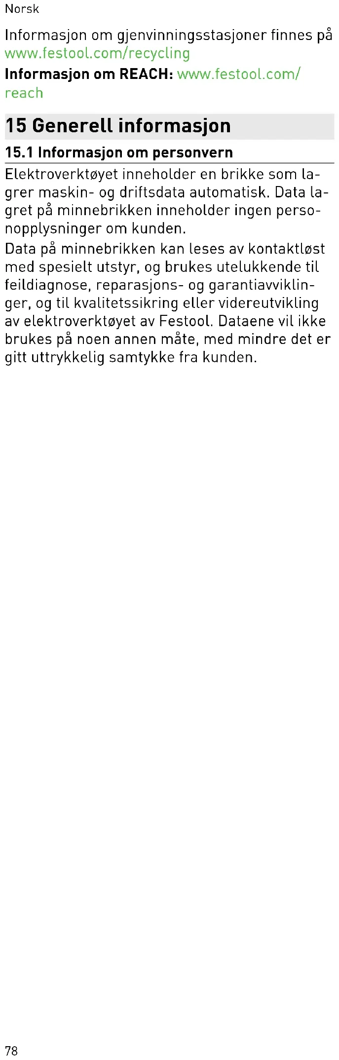 – Depois de trabalhar em metal: limpe o in terior da ferramenta elétrica por sopro através da ranhura de ventilação com ar comprimido seco e sem óleo. Caso contrá rio, pode depositar-se pó condutor no inte rior da ferramenta elétrica. Tal pode cau sar um curto-circuito. – Para assegurar a circulação do ar, as aber turas do ar de refrigeração na carcaça do motor devem ser mantidas sempre de sobstruídas e limpas. – Mantenha a fixação de ferramentas sempre limpa e sem aparas e impurezas. Retire a lâmina de serra da ferramenta elétrica (consultar o capítulo 9.3) e limpe a fixação de ferramentas (p. ex. com um pincel ou ar comprimido). Mantenha a fixação de ferramentas funcio nal com a utilização de lubrificantes adequ ados (p. ex. óleo para ferramentas). – Manter sempre limpos os contactos de li gação na ferramenta elétrica e na bateria. 13 Acessórios Utilize apenas ferramentas de trabalho e acessórios originais Festool. A utilização de ferramentas de trabalho de qualidade inferior e acessórios de outras marcas pode aumentar o perigo de ferimentos e provocar desequilíbrios consideráveis que pioram a qualidade dos re sultados de trabalho e aumentam o desgaste da ferramenta elétrica. Os números de encomenda para acessórios e ferramentas encontram-se no seu catálogo Festool ou na Internet em www.festool.pt. 14 Meio ambiente Não deite a ferramenta no lixo domésti co! Encaminhar as ferramentas, acessó rios e embalagens para reaproveitamen to ecológico. Respeitar as normas nacionais em vigor. Antes da eliminação, desde que existentes, as baterias e acumuladores usados que não este jam envoltos na ferramenta usada, bem como, lâmpadas, que possam ser retiradas do apare lho usado sem serem destruídas, devem ser retirados do aparelho usado. As baterias e acu muladores usados podem assim ser enviados para uma reciclagem conforme as regras. De acordo com a Diretiva Europeia sobre resí duos de equipamentos elétricos e eletrónicos e a sua transposição para a legislação nacional, as ferramentas elétricas usadas devem ser re colhidas separadamente e sujeitas a uma reci clagem que proteja o meio ambiente. Informações sobre os pontos de recolha para uma eliminação correta podem ser encontra das em www.festool.pt/recycling . Informações sobre REACH: www.festool.pt/ reach 15 Indicações gerais
