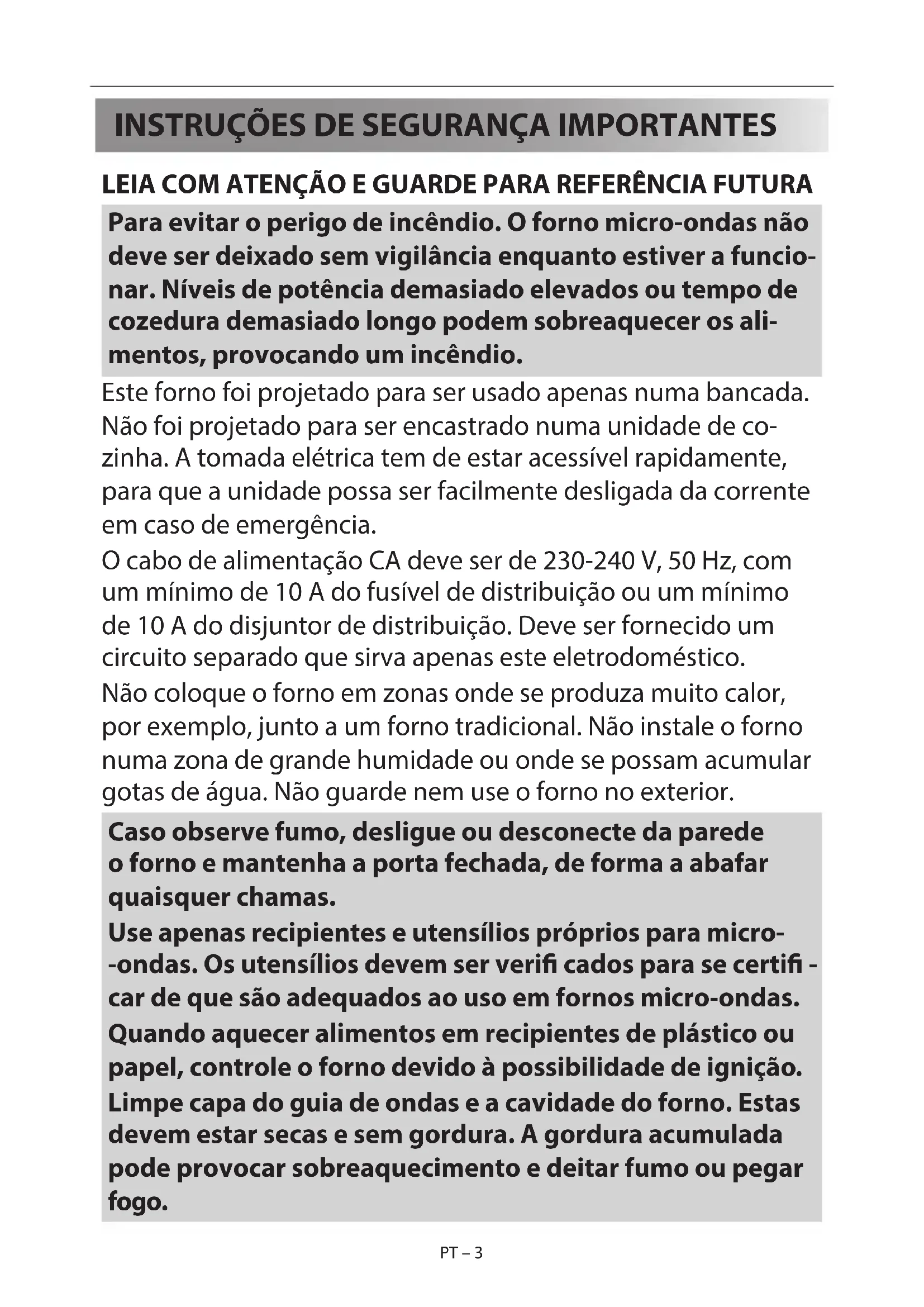 LEIA COM ATENÇÃO E GUARDE PARA REFERÊNCIA FUTURA Para evitar o perigo de incêndio. O forno micro-ondas não deve ser deixado sem vigilância enquanto estiver a funcio- nar. Níveis de potência demasiado elevados ou tempo de cozedura demasiado longo podem sobreaquecer os ali- mentos, provocando um incêndio. Este forno foi projetado para ser usado apenas numa bancada. Não foi projetado para ser encastrado numa unidade de co- zinha. A tomada elétrica tem de estar acessível rapidamente, para que a unidade possa ser facilmente desligada da corrente em caso de emergência. O cabo de alimentação CA deve ser de 230-240 V, 50 Hz, com um mínimo de 10 A do fusível de distribuição ou um mínimo de 10 A do disjuntor de distribuição. Deve ser fornecido um circuito separado que sirva apenas este eletrodoméstico. Não coloque o forno em zonas onde se produza muito calor, por exemplo, junto a um forno tradicional. Não instale o forno numa zona de grande humidade ou onde se possam acumular gotas de água. Não guarde nem use o forno no exterior. Caso observe fumo, desligue ou desconecte da parede o forno e mantenha a porta fechada, de forma a abafar quaisquer chamas. Use apenas recipientes e utensílios próprios para micro- -ondas. Os utensílios devem ser veri cados para se certi - car de que são adequados ao uso em fornos micro-ondas. Quando aquecer alimentos em recipientes de plástico ou papel, controle o forno devido à possibilidade de ignição. Limpe capa do guia de ondas e a cavidade do forno. Estas devem estar secas e sem gordura. A gordura acumulada pode provocar sobreaquecimento e deitar fumo ou pegar fogo.PT PT – 4 PT – 4 Não coloque materiais in amáveis perto do forno ou das aber- turas de ventilação. Não bloqueie as aberturas de ventilação. Retire todos os selos metálicos, arames, etc., da comida e de embalagens de comida. O arco elétrico nas superfícies metáli- cas pode provocar um incêndio. Não use o forno micro-ondas para aquecer óleo para fritar. A temperatura não pode ser controlada e o óleo pode pegar fogo. Para fazer pipocas, use apenas embalagens próprias para fazer pipocas no micro-ondas. Não guarde comida ou quaisquer outros objetos dentro do forno. Veri que as de nições quando iniciar o forno para ter a certeza que o forno está a funcionar como desejado. Não deixe o forno sem vigilância durante o funcionamento. Para evitar sobreaquecimento e fogo é necessário ter cuidado especial ao cozinhar ou reaquecer alimentos com muito açúcar ou teor de gordura, por exemplo, salsichas, tartes ou pudins. Veja as dicas correspondentes no manual de utilização. Para evitar o risco de lesões. ATENÇÃO: Não use o forno caso este esteja dani cado ou a funcionar mal. Veri que o seguinte antes de o usar: a) Certi que-se de que a porta se fecha devidamente e que não está desalinhada ou deformada. b) Veri que que as dobradiças e os fechos de segurança da porta não estão partidos ou soltos. c) Veja-se de que as vedações da porta e da superfície não foram dani cadas. d) Certi que-se de que no interior da cavidade do forno ou a porta não há brechas. e) Certi que-se de que o cabo de alimentação e a tomada não estão dani cados. Caso a porta ou as vedações da porta estejam dani cadas, o PT – 3PT – 3
