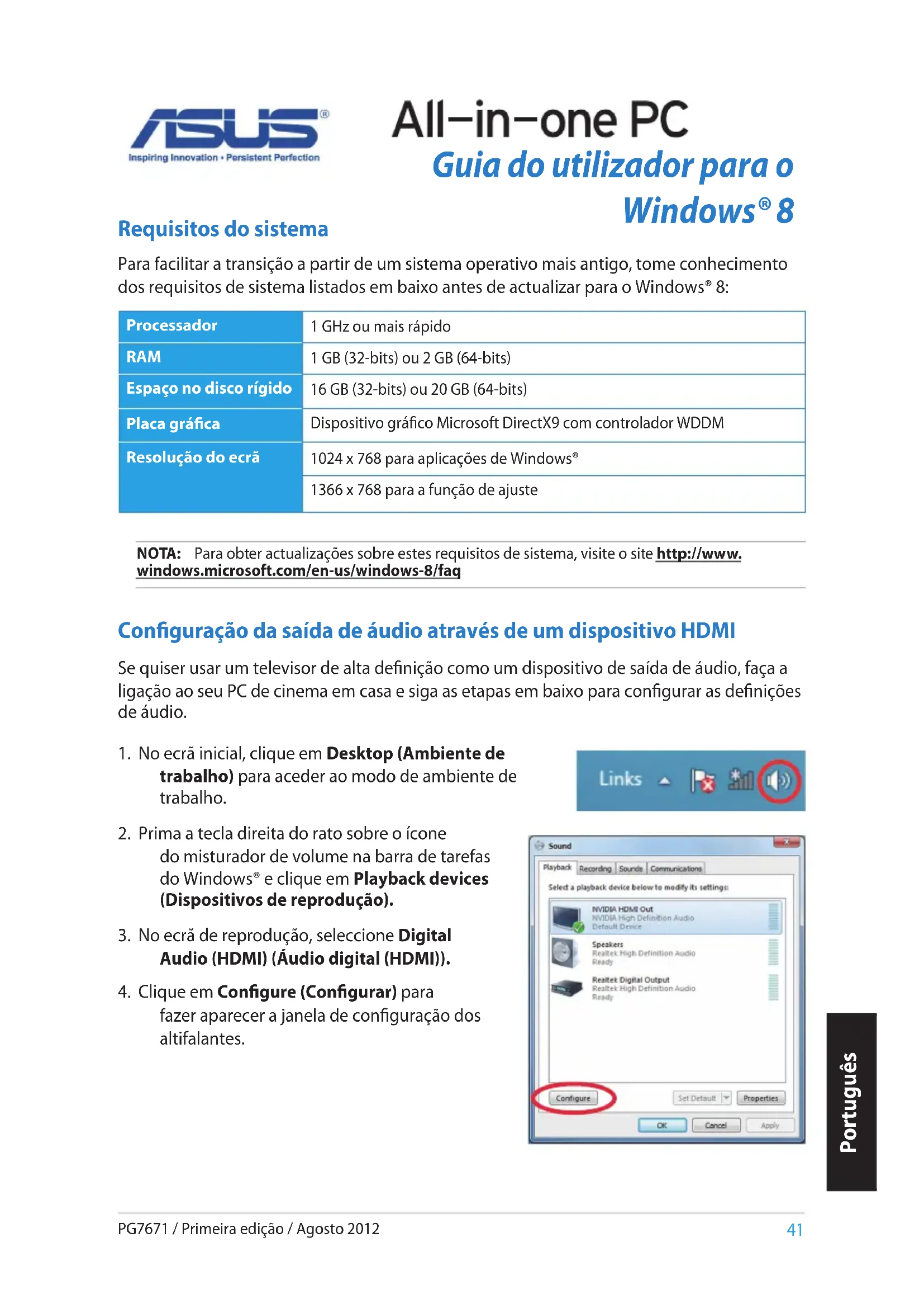 fazer aparecer a janela de conguração dos altifalantes. NOTA: Para obter actualizações sobre estes requisitos de sistema, visite o site http://www. windows.microsoft.com/en-us/windows-8/faq Processador 1 GHz ou mais rápido RAM 1 GB (32-bits) ou 2 GB (64-bits) Espaço no disco rígido 16 GB (32-bits) ou 20 GB (64-bits) Placa gráca Dispositivo gráco Microsoft DirectX9 com controlador WDDM Resolução do ecrã 1024 x 768 para aplicações de Windows® 1366 x 768 para a função de ajuste Requisitos do sistema Para facilitar a transição a partir de um sistema operativo mais antigo, tome conhecimento dos requisitos de sistema listados em baixo antes de actualizar para o Windows® 8: Português PG7671 / Primeira edição / Agosto 201242 Português