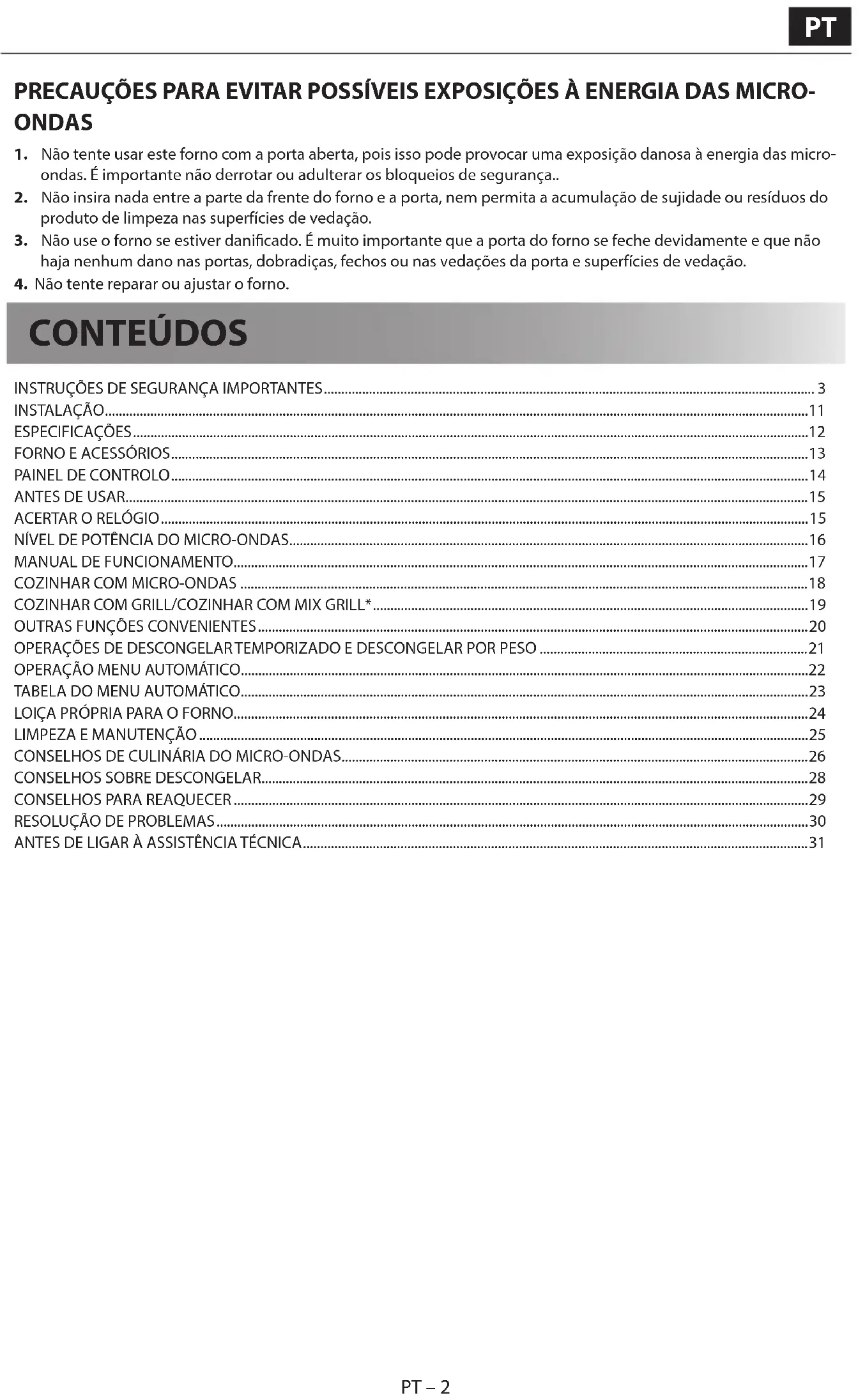 LEIA COM ATENÇÃO E GUARDE PARA REFERÊNCIA FUTURA Para evitar o perigo de incêndio. O forno micro-ondas não deve ser deixado sem vigilância enquanto estiver a funcio- nar. Níveis de potência demasiado elevados ou tempo de cozedura demasiado longo podem sobreaquecer os ali- mentos, provocando um incêndio. Este forno foi projetado para ser usado apenas numa bancada. Não foi projetado para ser encastrado numa unidade de co- zinha. A tomada elétrica tem de estar acessível rapidamente, para que a unidade possa ser facilmente desligada da corrente em caso de emergência. O cabo de alimentação CA deve ser de 230-240 V, 50 Hz, com um mínimo de 10 A do fusível de distribuição ou um mínimo de 10 A do disjuntor de distribuição. Deve ser fornecido um circuito separado que sirva apenas este eletrodoméstico. Não coloque o forno em zonas onde se produza muito calor, por exemplo, junto a um forno tradicional. Não instale o forno numa zona de grande humidade ou onde se possam acumular gotas de água. Não guarde nem use o forno no exterior. Caso observe fumo, desligue ou desconecte da parede o forno e mantenha a porta fechada, de forma a abafar quaisquer chamas. Use apenas recipientes e utensílios próprios para micro- -ondas. Os utensílios devem ser veri cados para se certi - car de que são adequados ao uso em fornos micro-ondas. Quando aquecer alimentos em recipientes de plástico ou papel, controle o forno devido à possibilidade de ignição. Limpe capa do guia de ondas e a cavidade do forno. Estas devem estar secas e sem gordura. A gordura acumulada pode provocar sobreaquecimento e deitar fumo ou pegar fogo.PT PT – 4 PT – 4 Não coloque materiais in amáveis perto do forno ou das aber- turas de ventilação. Não bloqueie as aberturas de ventilação. Retire todos os selos metálicos, arames, etc., da comida e de embalagens de comida. O arco elétrico nas superfícies metáli- cas pode provocar um incêndio. Não use o forno micro-ondas para aquecer óleo para fritar. A temperatura não pode ser controlada e o óleo pode pegar fogo. Para fazer pipocas, use apenas embalagens próprias para fazer pipocas no micro-ondas. Não guarde comida ou quaisquer outros objetos dentro do forno. Veri que as de nições quando iniciar o forno para ter a certeza que o forno está a funcionar como desejado. Não deixe o forno sem vigilância durante o funcionamento. Para evitar sobreaquecimento e fogo é necessário ter cuidado especial ao cozinhar ou reaquecer alimentos com muito açúcar ou teor de gordura, por exemplo, salsichas, tartes ou pudins. Veja as dicas correspondentes no manual de utilização. Para evitar o risco de lesões. ATENÇÃO: Não use o forno caso este esteja dani cado ou a funcionar mal. Veri que o seguinte antes de o usar: a) Certi que-se de que a porta se fecha devidamente e que não está desalinhada ou deformada. b) Veri que que as dobradiças e os fechos de segurança da porta não estão partidos ou soltos. c) Veja-se de que as vedações da porta e da superfície não foram dani cadas. d) Certi que-se de que no interior da cavidade do forno ou a porta não há brechas. e) Certi que-se de que o cabo de alimentação e a tomada não estão dani cados. Caso a porta ou as vedações da porta estejam dani cadas, o PT – 3PT – 3