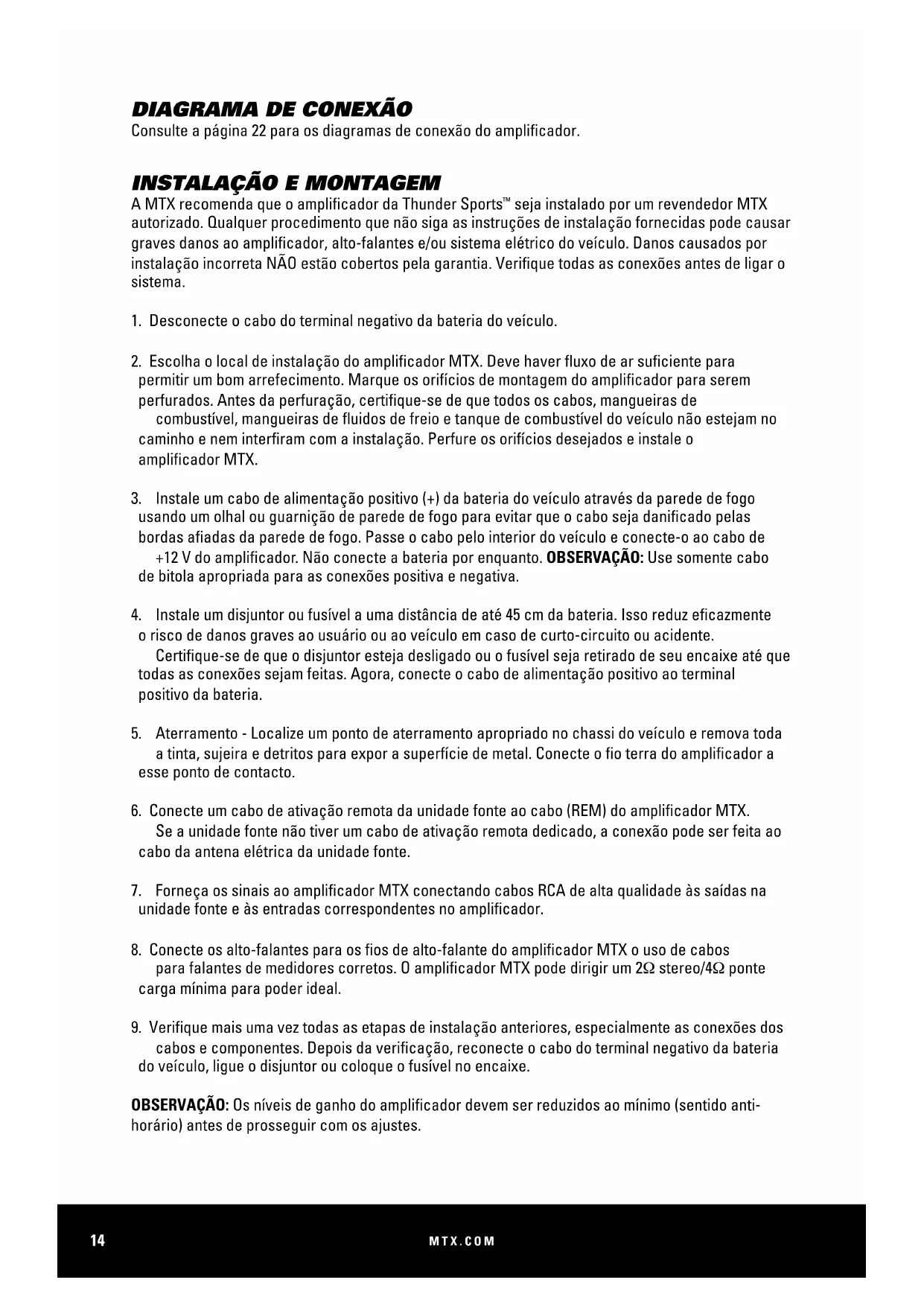 A MTX recomenda que seu novo amplicador seja instalado por um especialista em instalação de 12 volts. Qualquer desvio das instruções de instalação especicadas pode causar sérios danos ao amplicador, alto-falantes e / ou sistema elétrico do veículo. Danos causados por instalação incorreta NÃO são cobertos pela garantia. Por favor, verique todas as conexões antes de ligar o sistema.