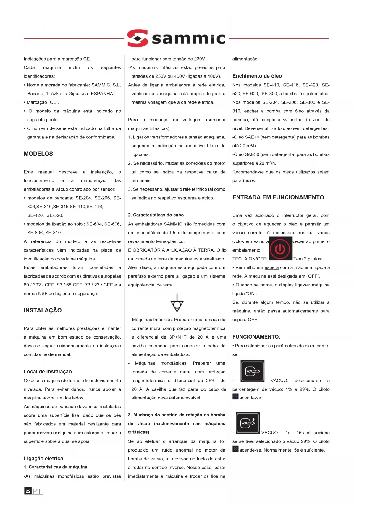 SE520 - Máquinas de embalagem a vácuo Sammic - Manual de utilização gratuito