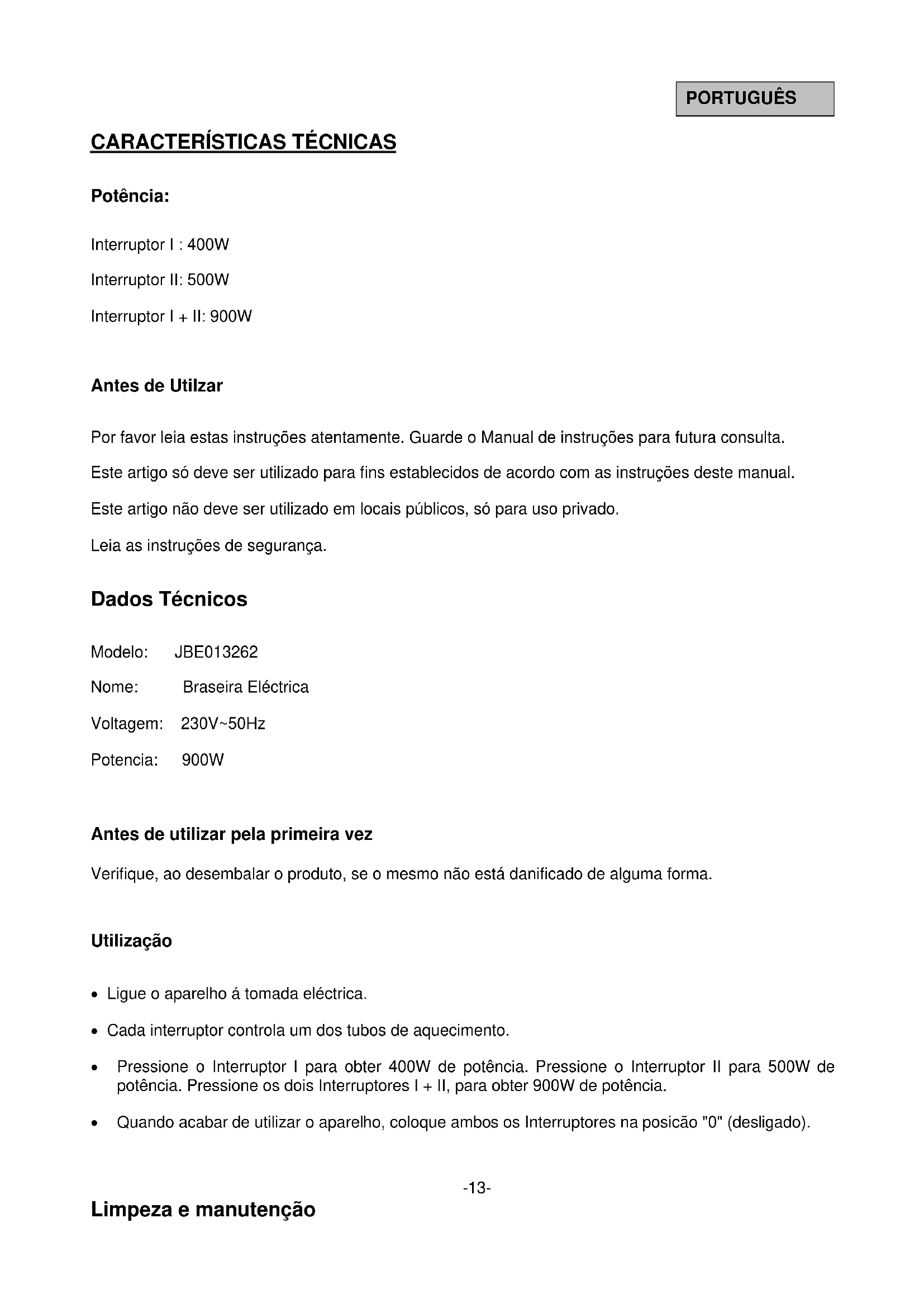 Antes de Utilzar Por favor leia estas instruções atentamente. Guarde o Manual de instruções para futura consulta. Este artigo só deve ser utilizado para fins establecidos de acordo com as instruções deste manual. Este artigo não deve ser utilizado em locais públicos, só para uso privado. Leia as instruções de segurança. Dados Técnicos Modelo: JBE013262 Nome: Braseira Eléctrica Voltagem: 230V~50Hz Potencia: 900W
