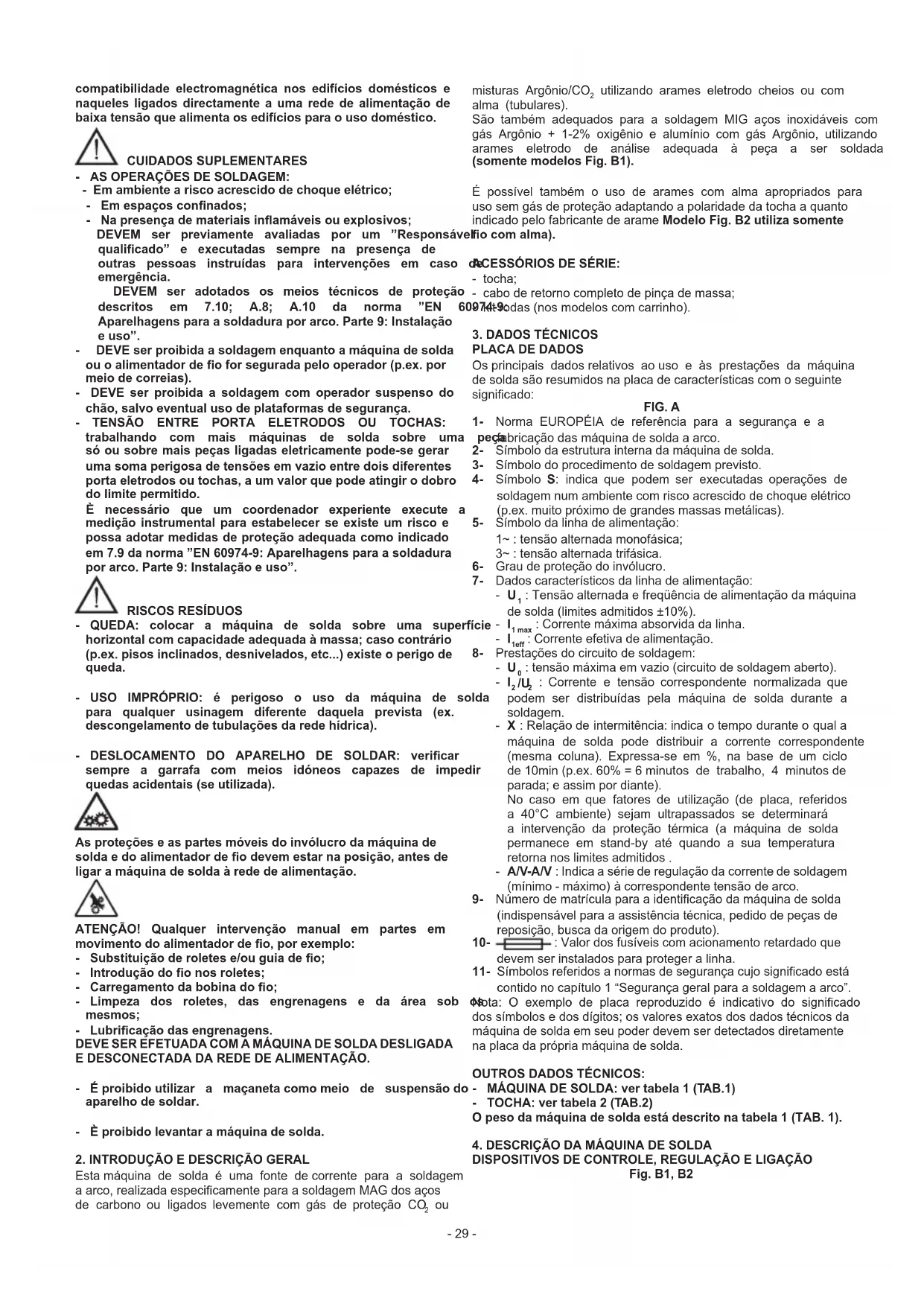 utilizando arames eletrodo cheios ou com alma (tubulares). São também adequados para a soldagem MIG aços inoxidáveis com gás Argônio + 1-2% oxigênio e alumínio com gás Argônio, utilizando arames eletrodo de análise adequada à peça a ser soldada (somente modelos Fig. B1). É possível também o uso de arames com alma apropriados para uso sem gás de proteção adaptando a polaridade da tocha a quanto indicado pelo fabricante de arame ModeloFig.B2utilizasomente ocomalma). ACESSÓRIOSDESÉRIE: - tocha; - cabo de retorno completo de pinça de massa; - kit rodas (nos modelos com carrinho).