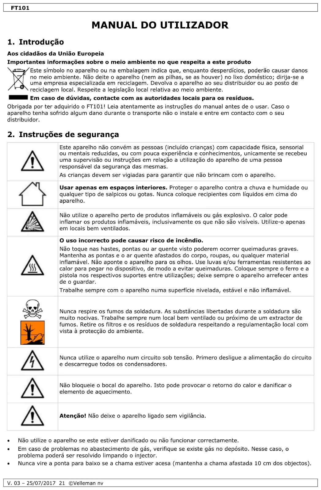 comprimento ......................................................................................................... 60 cm diâmetro do queimador ............................................................................................. 6 cm mangueira de gás .................................................................................................... 1.5 m Utilize este aparelho apenas com acessórios originais. A Velleman NV não será responsável por quaisquer danos ou lesões causados pelo uso (indevido) do aparelho. Para mais informação sobre este produto e para aceder à versão mais recente deste manual do utilizador, visite a nossa página www.toolland.eu. Podem alterar-se as especificações e o conteúdo deste manual sem aviso prévio.
