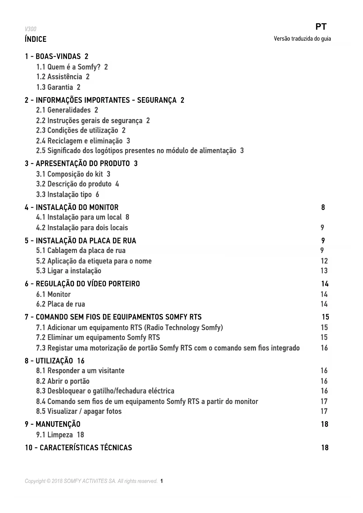O alcance rádio é limitado pelas normas de regulamentação dos aparelhos rádio. O alcance rádio depende em grande parte do ambiente de utilização: possíveis perturbações provocadas por grandes aparelhos eléctricos situados nas proximidades da instalação, tipo de material utilizado nas paredes e divisórias do local. A utilização de aparelhos rádio (por exemplo, auscultadores de rádio hi-fi) que utilizem a mesma radiofrequência pode diminuir a eficiência do produto. A câmara deste vídeo porteiro tem por função identificar um visitante e, em nenhum caso, deve ser usada para vigiar a rua. Esta instalação deve ser utilizada em conformidade com a Lei Informática e Liberdades. Qualquer utilização destes produtos fora do âmbito estritamente pessoal está sujeita às obrigações legais de utilização e à obtenção prévia de autorizações administrativas. O comprador pode comprometer a sua responsabilidade civil e criminal em caso de utilização indevida do dispositivo com o objectivo de atentar contra a vida privada ou a imagem de terceiros; a Somfy não poderá, em caso algum, ser responsabilizada devido a utilização do vídeo porteiro que viole as disposições legais e regulamentares em vigor.Copyright © 2018 SOMFY ACTIVITES SA. All rights reserved. 3 V300