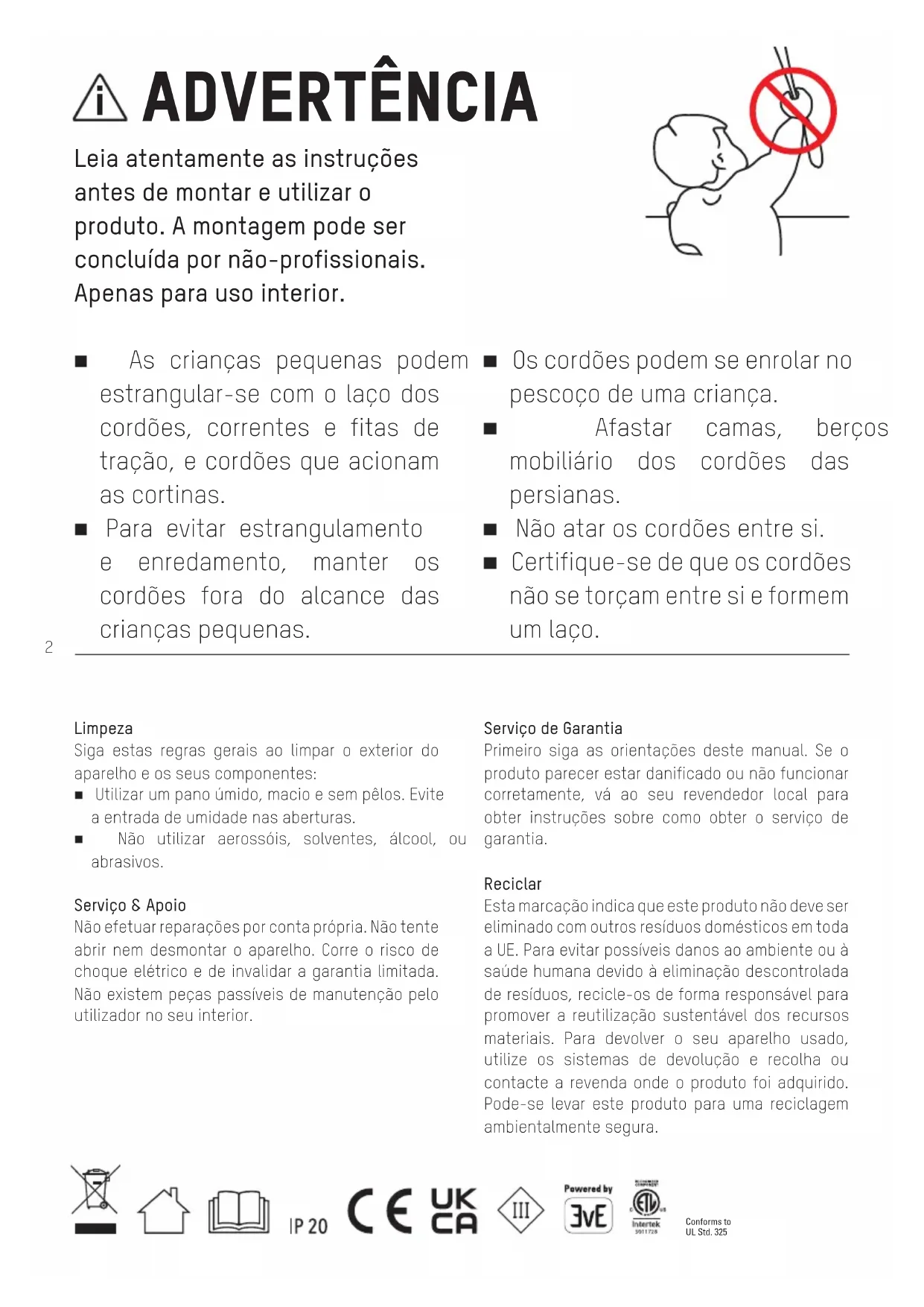 ponownie. stronę 24 3)Zamknąć aplikację i ponownie połączyć się ze swoim silnikiem.25 POLSKIManual do usuário Cortina Roller Motor CM-03-E/CM-05-E/CM-45-E PT2 Con forms to UL Std. 325 Limpeza Siga estas regras gerais ao limpar o exterior do aparelho e os seus componentes: Utilizar um pano úmido, macio e sem pêlos. Evite a entrada de umidade nas aberturas. Não utilizar aerossóis, solventes, álcool, ou abrasivos. Serviço & Apoio Não efetuar reparações por conta própria. Não tente abrir nem desmontar o aparelho. Corre o risco de choque elétrico e de invalidar a garantia limitada. Não existem peças passíveis de manutenção pelo utilizador no seu interior. Serviço de Garantia Primeiro siga as orientações deste manual. Se o produto parecer estar danificado ou não funcionar corretamente, vá ao seu revendedor local para obter instruções sobre como obter o serviço de garantia. Reciclar Esta marcação indica que este produto não deve ser eliminado com outros resíduos domésticos em toda a UE. Para evitar possíveis danos ao ambiente ou à saúde humana devido à eliminação descontrolada de resíduos, recicle-os de forma responsável para promover a reutilização sustentável dos recursos materiais. Para devolver o seu aparelho usado, utilize os sistemas de devolução e recolha ou contacte a revenda onde o produto foi adquirido. Pode-se levar este produto para uma reciclagem ambientalmente segura. Leia atentamente as instruções antes de montar e utilizar o produto. A montagem pode ser concluída por não-profissionais. Apenas para uso interior. As crianças pequenas podem estrangular-se com o laço dos cordões, correntes e fitas de tração, e cordões que acionam as cortinas. Para evitar estrangulamento e enredamento, manter os cordões fora do alcance das crianças pequenas. Os cordões podem se enrolar no pescoço de uma criança. Afastar camas, berços e mobiliário dos cordões das persianas. Não atar os cordões entre si. Certifique-se de que os cordões não se torçam entre si e formem um laço. ADVERTÊNCIA3 Entrada de carregamento USB-C LED (indicador de bateria/ Reinicialização) Botão de posição final Botão Reiniciar/Programar Controle por toque Botões e funções PORTUGUÊS4 MN180 020_2 0180713 1/4 2 x 2 x 2 x 4 x