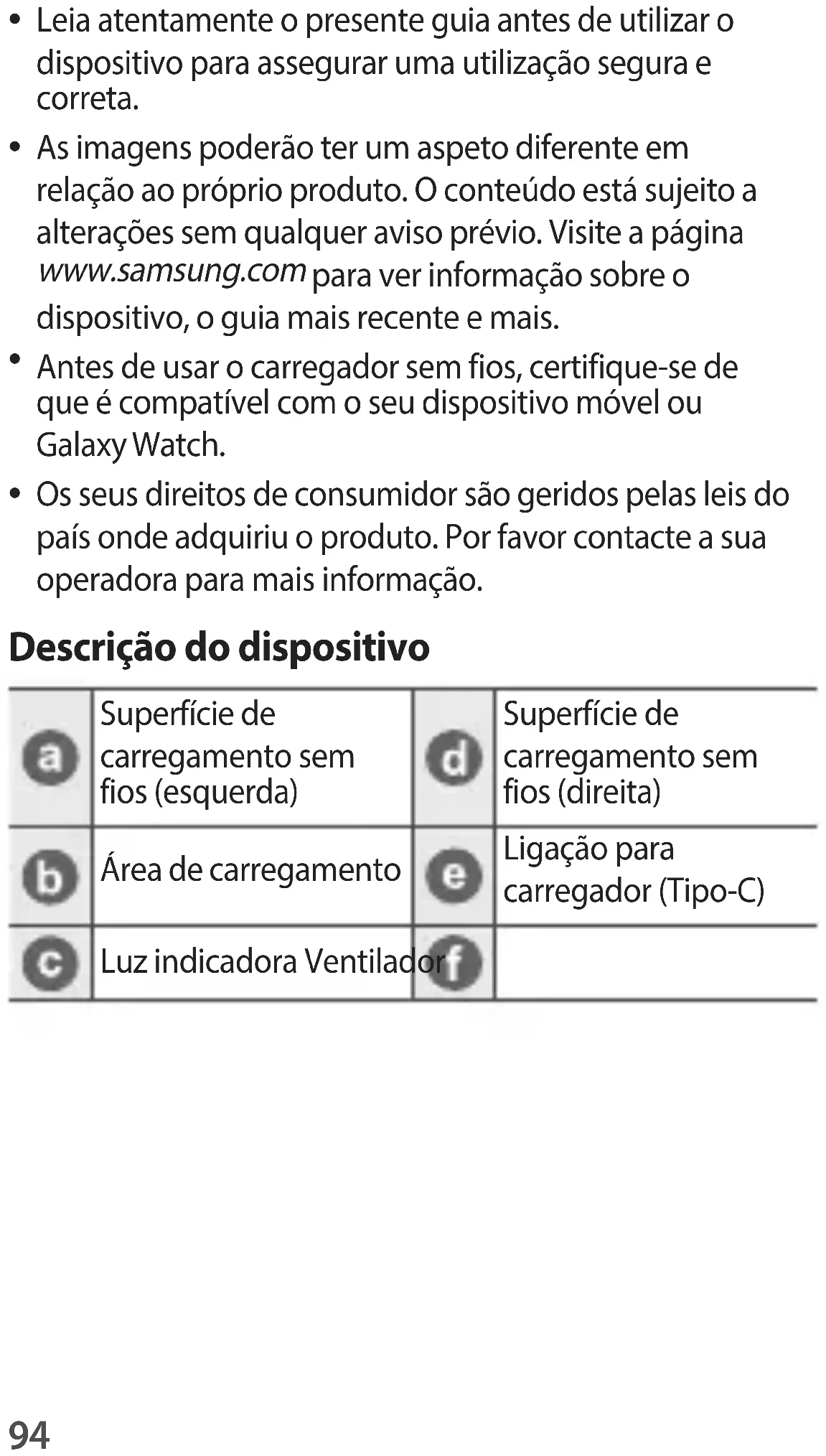 Os seus direitos de consumidor são geridos pelas leis do país onde adquiriu o produto. Por favor contacte a sua operadora para mais informação. Descrição do dispositivo Superfície de carregamento sem fios (esquerda) Superfície de carregamento sem fios (direita) Área de carregamento Ligação para carregador (Tipo-C) Luz indicadora Ventilador Português95 Português Utilizar o carregador sem fios
