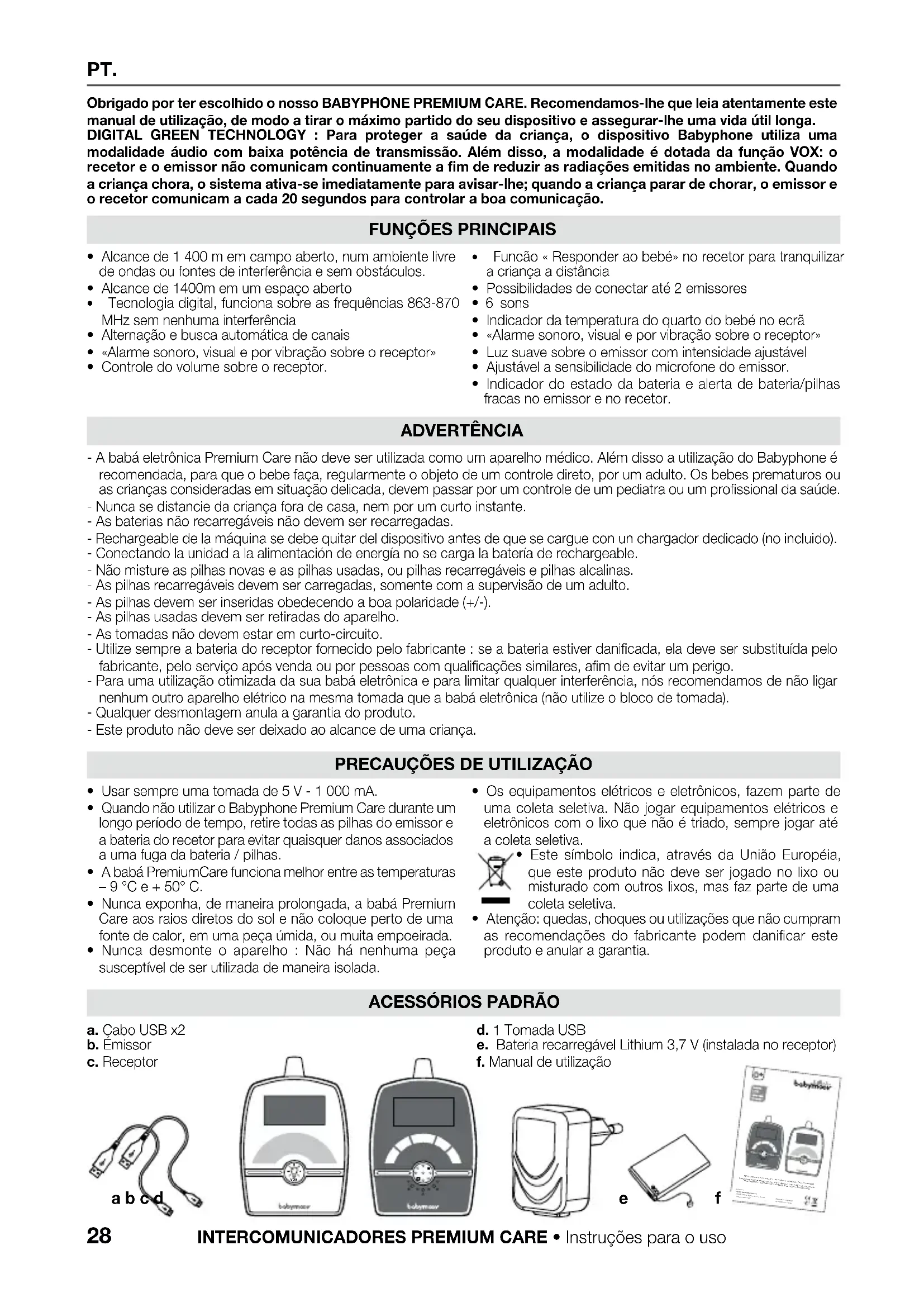 REGOLAZIONE DELLA LUMINOSITÀ VOX DELLA LUCE NOTTURNA IMPOSTAZIONI TASTO “RISPONDERE AL BAMBINO” x1 5 x628 PT. Obrigado por ter escolhido o nosso BABYPHONE PREMIUM CARE. Recomendamos-lhe que leia atentamente este manual de utilização, de modo a tirar o máximo partido do seu dispositivo e assegurar-lhe uma vida útil longa. DIGITAL GREEN TECHNOLOGY : Para proteger a saúde da criança, o dispositivo Babyphone utiliza uma modalidade áudio com baixa potência de transmissão. Além disso, a modalidade é dotada da função VOX: o recetor e o emissor não comunicam continuamente a fim de reduzir as radiações emitidas no ambiente. Quando a criança chora, o sistema ativa-se imediatamente para avisar-lhe; quando a criança parar de chorar, o emissor e o recetor comunicam a cada 20 segundos para controlar a boa comunicação.