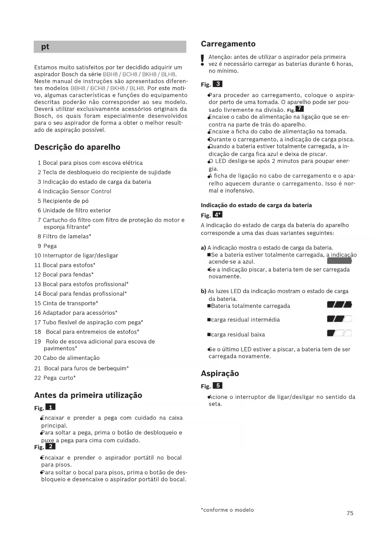 Estamos muito satisfeitos por ter decidido adquirir um aspirador Bosch da série BBH8 / BCH8 / BKH8 / BLH8. Neste manual de instruções são apresentados diferen- tes modelos BBH8 / BCH8 / BKH8 / BLH8. Por este moti- vo, algumas características e funções do equipamento descritas poderão não corresponder ao seu modelo. Deverá utilizar exclusivamente acessórios originais da Bosch, os quais foram especialmente desenvolvidos para o seu aspirador de forma a obter o melhor result- ado de aspiração possível. Descrição do aparelho 1 Bocal para pisos com escova elétrica 2 Tecla de desbloqueio do recipiente de sujidade 3 Indicação do estado de carga da bateria 4 Indicação Sensor Control 5 Recipiente de pó 6 Unidade de filtro exterior 7 Cartucho do filtro com filtro de proteção do motor e esponja filtrante* 8 Filtro de lamelas* 9 Pega 10 Interruptor de ligar/desligar 11 Bocal para estofos* 12 Bocal para fendas* 13 Bocal para estofos profissional* 14 Bocal para fendas profissional* 15 Cinta de transporte* 16 Adaptador para acessórios* 17 Tubo flexível de aspiração com pega* 18 Bocal para entremeios de estofos* 19 Rolo de escova adicional para escova de pavimentos* 20 Cabo de alimentação 21 Bocal para furos de berbequim* 22 Pega curto* Antes da primeira utilização Fig.