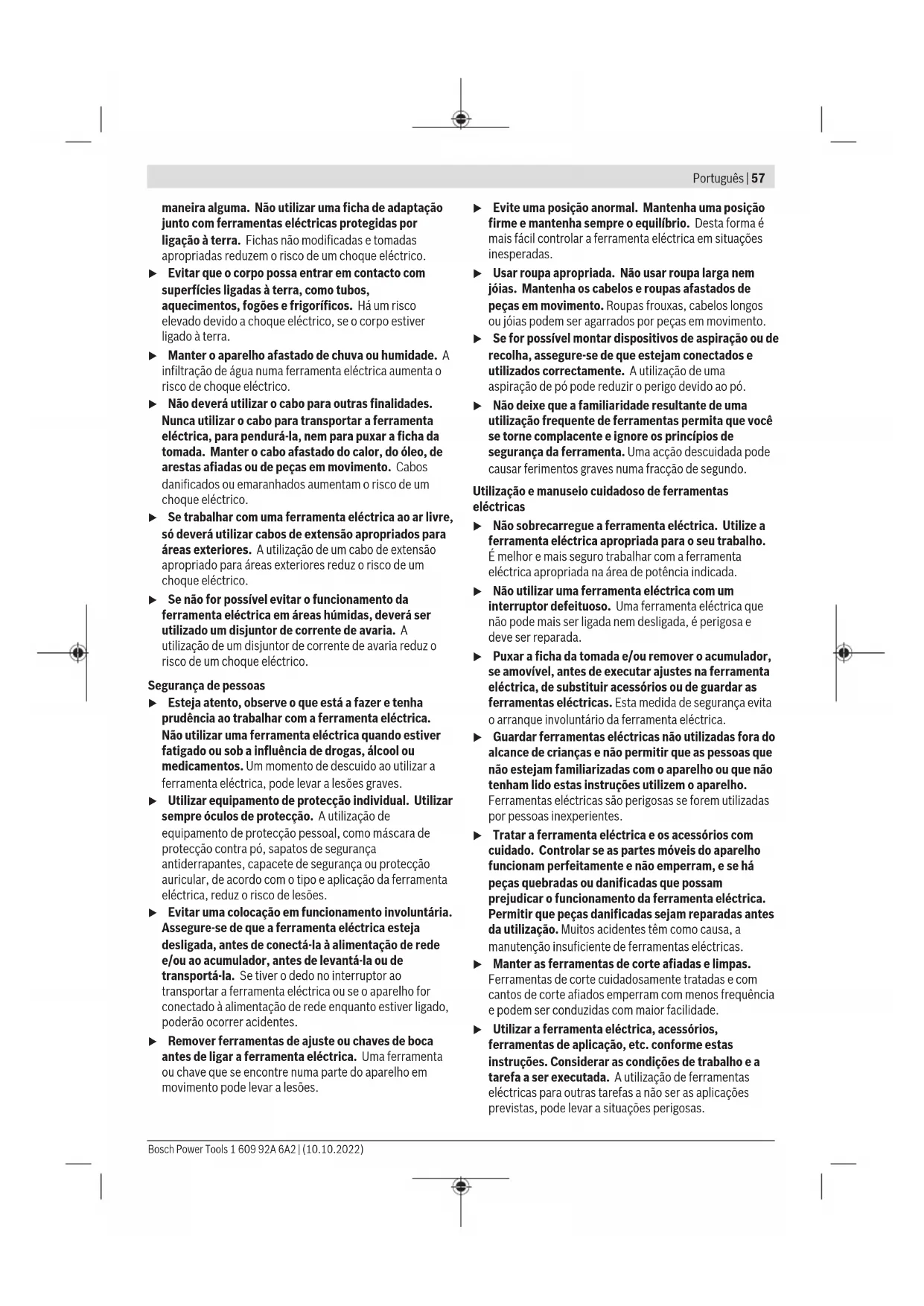 Os valores indicados dos níveis de rotação são valores de referência. Montagem Montar o dispositivo de proteção u Antes de todos trabalhos na ferramenta elétrica deverá puxar a ficha de rede da tomada. Nota: Se o disco abrasivo quebrar durante o funcionamento ou se os dispositivos de fixação na tampa de proteção/na ferramenta elétrica estiverem danificados, será necessário que a ferramenta elétrica seja enviada imediatamente ao serviço pós-venda, os endereços encontram-se na secção "Serviço pós-venda e aconselhamento". Tampa de proteção para lixar Coloque a tampa de proteção (11) no encaixe na ferramenta elétrica até as saliências de codificação da tampa de proteção coincidirem com o encaixe. Para tal, prima e segure a alavanca de destravamento (1). Pressione a tampa de proteção (11) na gola do veio até o colar da tampa de proteção assentar no flange da ferramenta elétrica e rode a tampa de proteção, até esta encaixar de forma audível. Ajuste a posição da tampa de proteção (11) de acordo com os requisitos da operação. Para tal, prima a alavanca de destravamento (1) para cima e rode a tampa de proteção (11) para a posição desejada. u Ajuste sempre a tampa de proteção (11) de forma a que os dois cames da alavanca de destravamento(1) encaixem nos respetivos entalhes da tampa de proteção(11). u Ajuste a tampa de proteção (11)de modo a evitar que voem faíscas na direção do operador. u A tampa de proteção (11) não pode rodar quando se aciona a alavanca de destravamento (1) ! Caso contrário, não deverá de modo algum continuar a utilizar a ferramenta elétrica, mas enviá-la ao serviço pós-venda. Nota: As saliências de codificação nas tampas de proteção (11)asseguram que só é montada a tampa de proteção adequada na ferramenta elétrica. Bosch Power Tools 1 609 92A 6A2 | (10.10.2022)64 | Português Tampa de proteção para cortar u Para cortar utilize sempre a tampa de proteção para cortar(13) ou a tampa de proteção para lixar (11) juntamente com a cobertura para cortar(15). u Ao cortar em pedra assegure uma aspiração de pó suficiente. A tampa de proteção para cortar(13) é montada como a tampa de proteção para lixar(11). Cobertura para cortar em metal Monte a cobertura para cortar(15) em metal na tampa de proteção para lixar(11) (verfiguraA): oscile o arco de suporte para trás (➊). Encaixe a cobertura(15) na tampa de proteção para lixar(11) (➋). Pressione o arco de suporte na tampa de proteção(11) (➌). Para a desmontagem (verfiguraB) pressione o botão no arco de suporte (➊) e oscile-o para trás (➋). Retire a cobertura(15) da tampa de proteção(11) (➌). Cobertura para cortar em plástico Encaixe a cobertura para cortar(15) em plástico na tampa de proteção para lixar(11) (verfiguraC). A cobertura(15) engata de forma audível e visível na tampa de proteção(11). Para a desmontagem (verfiguraD) desbloqueie a cobertura(15) na tampa de proteção(11) (➊) esquerda ou direita e retire a cobertura (➋). Tampa de aspiração para cortar com patim de guia A tampa de aspiração para cortar com patim de guia(27) é montada como a tampa de proteção para lixar. Mediante a fixação do punho adicional(9)/(10) através do arco na tampa de aspiração na carcaça da engrenagem, a ferramenta elétrica é ligada de forma fixa com a tampa de aspiração. Na tampa de aspiração com patim de guia(27) pode ser conectado um aspirador de pó Bosch apropriado. Para isso, encaixe a mangueira de aspiração com o adaptador de aspiração nas peças de alojamento previstas da tampa de aspiração. Nota: O atrito formado através do pó na mangueira de aspiração e no acessório durante a aspiração, provoca uma carga eletrostática que pode percecionar o utilizador como descarga estática (dependendo dos fatores ambientais e do seu estado fisiológico). A Bosch recomenda de uma forma geral a utilização de uma mangueira de aspiração antiestática (acessório) para a aspiração de pó fino e materiais secos. Proteção das mãos u Para trabalhos com o prato de lixar em borracha(20) ou com a catrabucha tipo tacho/catrabucha em forma de cone/broca de coroa de diamante monte sempre a proteção das mãos (19). Fixe a proteção das mãos (19) com o punho adicional (9). Punho adicional padrão/punho adicional antivibrações Dependendo do modo de operação, enrosque o punho adicional(9)/(10) à direita ou à esquerda na cabeça do mecanismo de acionamento. u Utilize a ferramenta elétrica apenas com o punho adicional(9)/(10). u Não continue a utilizar a ferramenta elétrica se o punho adicional(9)/(10) estiver danificado. Não efetue quaisquer alterações no punho adicional (9)/ (10). O punho adicional antivibrações(10) reduz as vibrações, proporcionando um trabalho agradável e seguro. Montar e desmontar as ferramentas de lixar Respeite as instruções de montagem especiais para as ferramentas de trabalho X- LOCK. u Antes de todos trabalhos na ferramenta elétrica deverá puxar a ficha de rede da tomada. u Não tocar nos discos abrasivos e de corte, antes que arrefeçam. Os discos tornam‑se extremamente quentes durante o trabalho. u Use apenas ferramentas de trabalho X-LOCK originais que ostentam o logótipo X-LOCK. Só nas ferramentas de trabalho X-LOCK originais é garantido que a espessura tensora de no máx. 1,6mm é mantida. Uma espessura tensora maior pode provocar uma fixação não segura e, consequentemente, que a ferramenta se solte. u As ferramentas de trabalho X-LOCK não necessitam de flanges tensores e de apoio adicionais. u Certifique-se de que o acessório, assim como o encaixe, não está deformado, nem tem sujidade e partículas. Observe as dimensões das ferramentas de lixar. Certifique-se de que ambos os entalhes X-LOCK estão abertos (ver figura seguinte), antes de montar a ferramenta de trabalho X-LOCK. Se necessário, limpe a área entre os dois entalhes X-LOCK. Monta