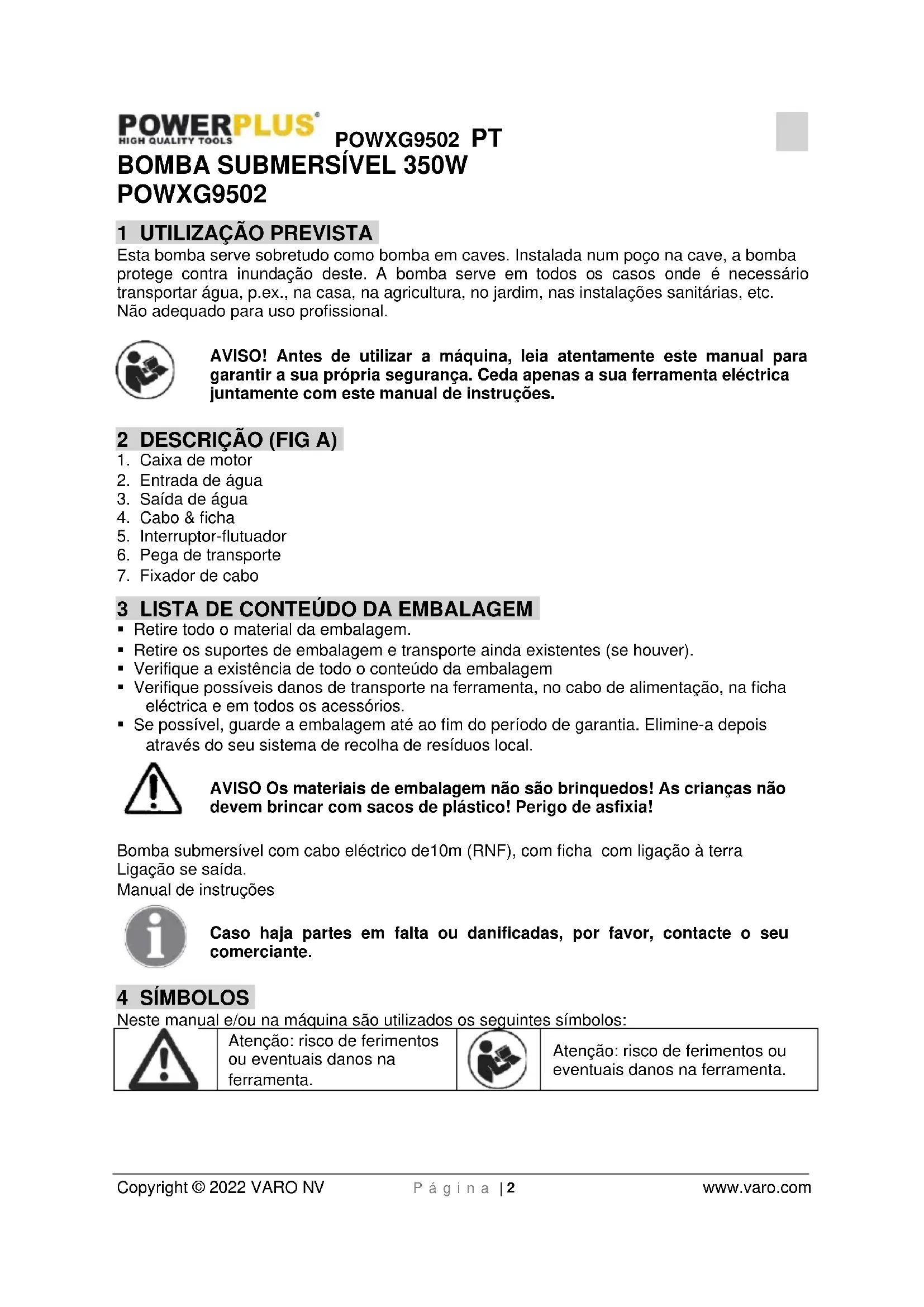 - de forma fixa com mangueira flexível. Atenção! Ao instalar a bomba, tenha em atenção que ela nunca deve ficar suspensa livremente no seu tubo de saída ou no cabo eléctrico. A motobomba submersível deve ser suspensa na asa prevista para este fim ou ser colocada sobre o fundo do poço. Para garantir o perfeito funcionamento da bomba, o fundo do poço sempre deve estar livre de lama ou outra sujidade. Se o nível de água for demasiado baixo, a lama pode endurecer rapidamente e impedir o arranque da bomba. Por isso, é preciso controlar a motobomba submersível em intervalos regulares (fazer um ensaio de arranque). O flutuador está ajustado de forma a que a bomba possa ser imediatamente colocada em serviço. Observação! As dimensões mínimas do poço onde a bomba é instalada devem corresponder a 40 x 40 x 50 cm para permitir o livre movimento do interruptor-flutuador.POWXG9502 PT Copyright © 2022 VARO NV P á g i n a | 4 www.varo.com Conexão à rede eléctrica A bomba submersível que adquiriu está equipada com uma ficha eléctrica com contacto de segurança. A bomba deve ser conectada a uma tomada eléctrica com contacto de segurança de 230 Volts/50Hz. Assegure-se que o fusível que protege a tomada eléctrica apresente uma protecção suficiente (pelo menos 6 A) e esteja em ordem. Introduza a ficha eléctrica da bomba na tomada e a bomba estará pronta a funcionar. Nota importante! Se o cabo de ligação à rede ou a ficha estiverem danificados devido a causas externas, não é permitido reparar o cabo eléctrico.