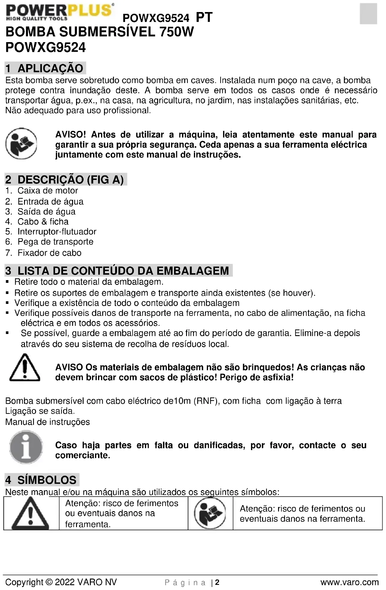 - de forma fixa com mangueira flexível. Atenção! Ao instalar a bomba, tenha em atenção que ela nunca deve ficar suspensa livremente no seu tubo de saída ou no cabo eléctrico. A motobomba submersível deve ser suspensa na asa prevista para este fim ou ser colocada sobre o fundo do poço. Para garantir o perfeito funcionamento da bomba, o fundo do poço sempre deve estar livre de lama ou outra sujidade. Se o nível de água for demasiado baixo, a lama pode endurecer rapidamente e impedir o arranque da bomba. Por isso, é preciso controlar a motobomba submersível em intervalos regulares (fazer um ensaio de arranque). O flutuador está ajustado de forma a que a bomba possa ser imediatamente colocada em serviço. Observação! As dimensões mínimas do poço onde a bomba é instalada devem corresponder a 40 x 40 x 50 cm para permitir o livre movimento do interruptor-flutuador. Conexão à rede eléctricaPOWXG9524 PT Copyright © 2022 VARO NV P á g i n a | 4 www.varo.com A bomba submersível que adquiriu está equipada com uma ficha eléctrica com contacto de segurança. A bomba deve ser conectada a uma tomada eléctrica com contacto de segurança de 230 Volts/50Hz. Assegure-se que o fusível que protege a tomada eléctrica apresente uma protecção suficiente (pelo menos 6 A) e esteja em ordem. Introduza a ficha eléctrica da bomba na tomada e a bomba estará pronta a funcionar. Nota importante! Se o cabo de ligação à rede ou a ficha estiverem danificados devido a causas externas, não é permitido reparar o cabo eléctrico.