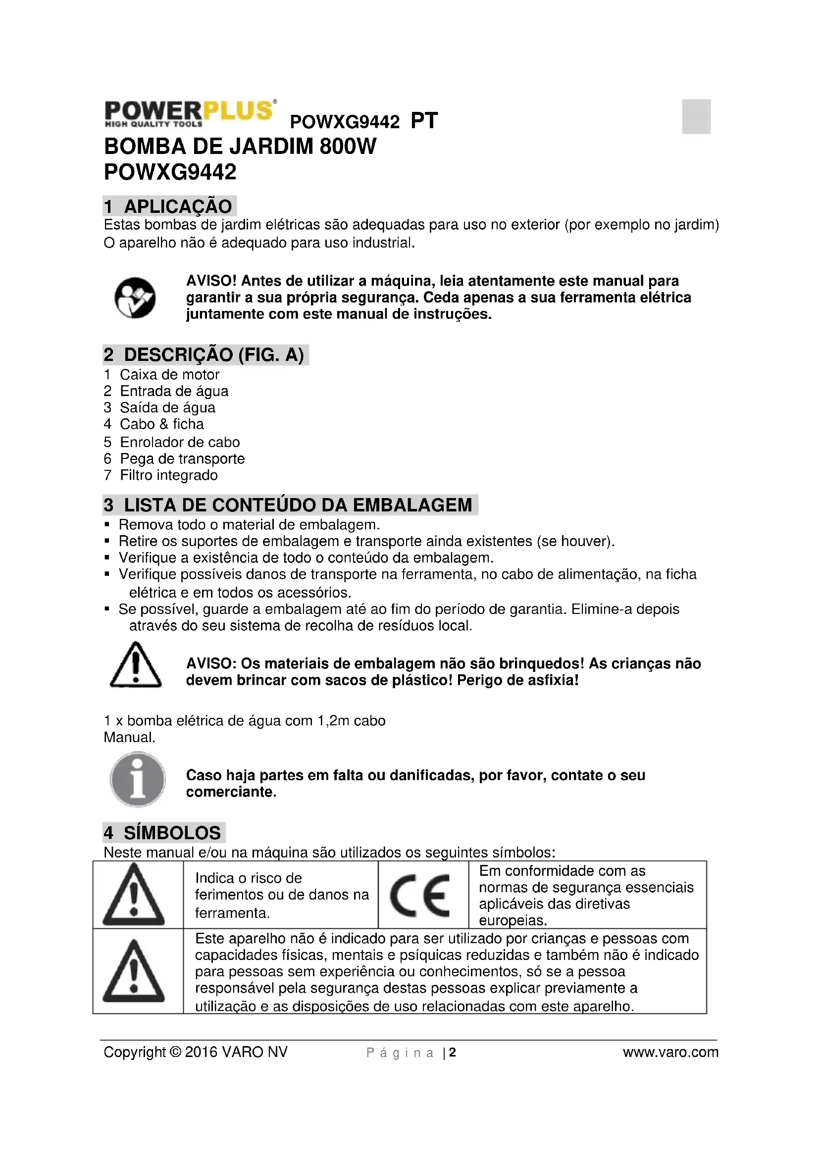 VARO N.V. – Joseph Van Instraat 9 – BE2500 Lier – Bélgica, declara que, Designação do aparelho: Bomba De Jardim Marca: POWERplus Modelo nº.: POWXG9442 se encontra em conformidade com os requisitos essenciais e outras provisões relevantes das Diretivas Comunitárias aplicáveis, com base na aplicação das normas Europeias harmonizadas. Qualquer alteração não autorizada do equipamento anula esta declaração. Diretivas Europeias (incluindo, se aplicável, as respetivas emendas até à data de assinatura); 2011/65/EU 2006/95/CE 2004/108/CE 2000/14/EC Annex V LwA 81dB(A) / 84dB(A) Normas Europeias harmonizadas (incluindo, se aplicável, as respetivas emendas até à data de assinatura); EN60335-1 : 2012 EN60335-2-41 : 2003 EN55014-1 : 2006 EN55014-2 : 1997 EN61000-3-2 : 2006 EN61000-3-3 : 2013 Detentor da Documentação Técnica: Philippe Vankerkhove, VARO – Vic. Van Rompuy N.V. O signatário atua em nome da administração da empresa, Hugo Cuypers Assuntos Regulamentares – Gestor de Conformidade 26/06/2015POWXG9442 NO Copyright © 2016 VARO NV S i d e | 1 www.varo.com 1 BRUKSOMRÅDE ............................................................................... 2