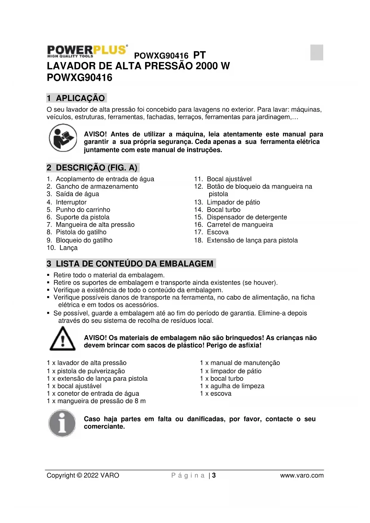 - Se possível, guarde a embalagem até ao fim do período de garantia. Elimine-a depois através do seu sistema de recolha de resíduos local. AVISO! Os materiais de embalagem não são brinquedos! As crianças não devem brincar com sacos de plástico! Perigo de asfixia! 1 x lavador de alta pressão 1 x pistola de pulverização 1 x extensão de lança para pistola 1 x bocal ajustável 1 x conetor de entrada de água 1 x mangueira de pressão de 8 m 1 x manual de manutenção 1 x limpador de pátio 1 x bocal turbo 1 x agulha de limpeza 1 x escova Caso haja partes em falta ou danificadas, por favor, contacte o seu comerciante.POWXG90416 PT Copyright © 2022 VARO P á g i n a | 4 www.varo.com