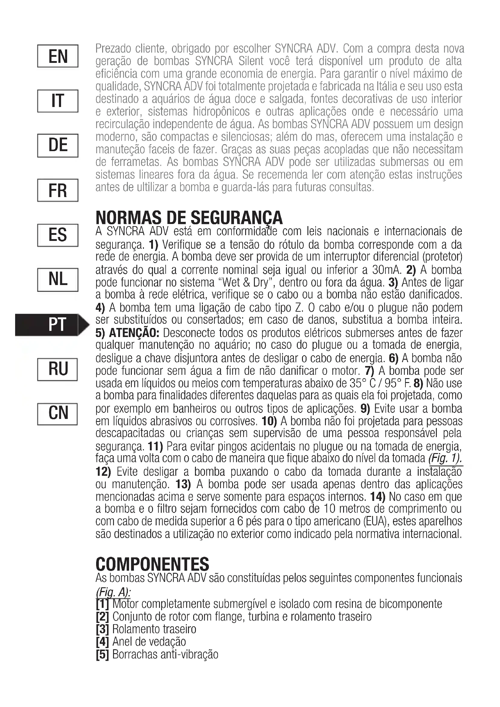 CNPrezado cliente, obrigado por escolher SYNCRA ADV. Com a compra desta nova geração de bombas SYNCRA Silent você terá disponível um produto de alta eficiência com uma grande economia de energia. Para garantir o nível máximo de qualidade, SYNCRA ADV foi totalmente projetada e fabricada na Itália e seu uso esta destinado a aquários de água doce e salgada, fontes decorativas de uso interior e exterior, sistemas hidropônicos e outras aplicações onde e necessário uma recirculação independente de água. As bombas SYNCRA ADV possuem um design moderno, são compactas e silenciosas; além do mas, oferecem uma instalação e manuteção faceis de fazer. Graças as suas peças acopladas que não necessitam de ferrametas. As bombas SYNCRA ADV pode ser utilizadas submersas ou em sistemas lineares fora da água. Se recemenda ler com atenção estas instruções antes de ultilizar a bomba e guarda-lás para futuras consultas.