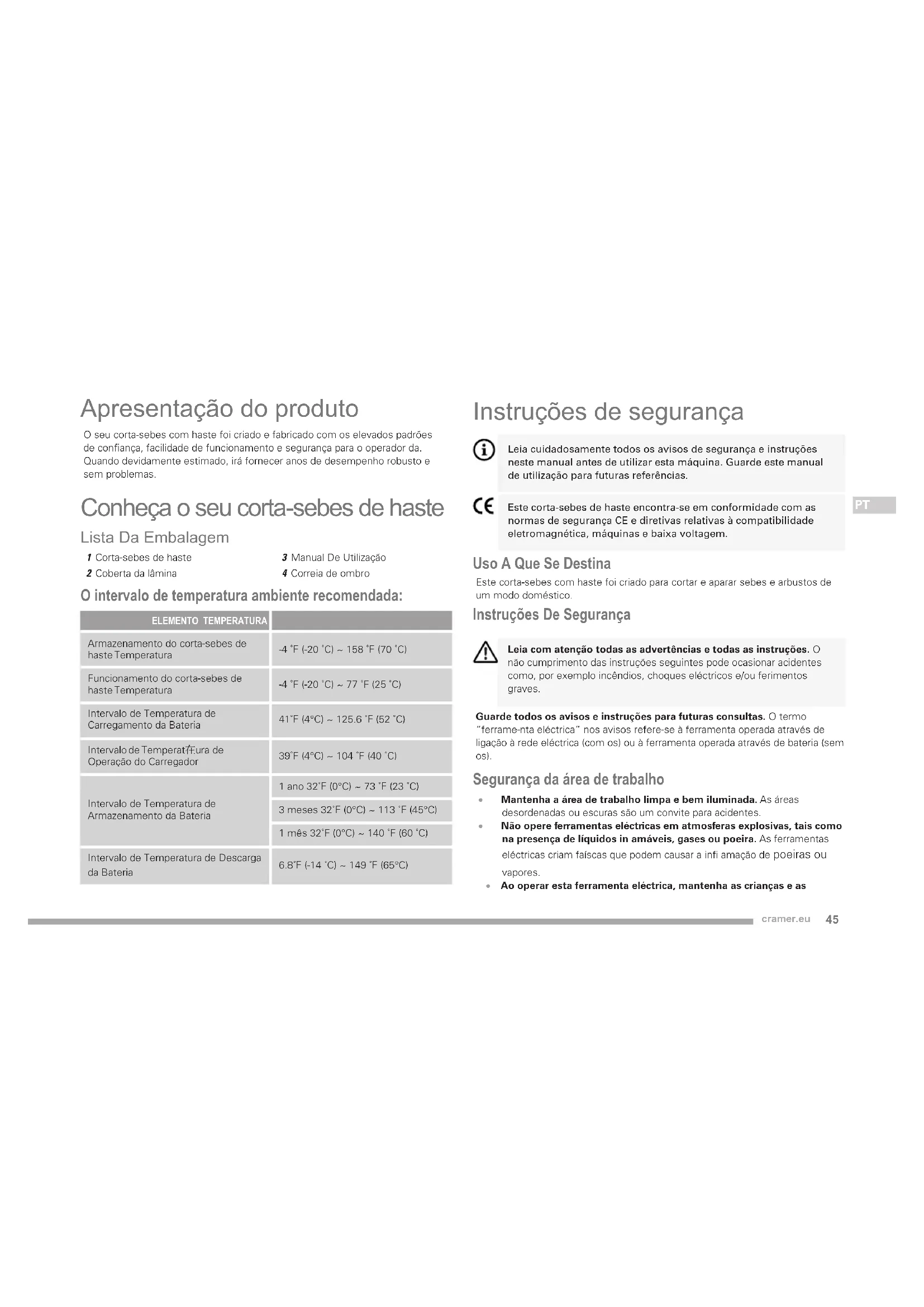 - Verifique regularmente se as pegas estão bem fixadas. Armazenamento Da Máquina Reveja a tabela da temperatura ambiente para se informar quanto à temperatura de armazenamento. Quando for necessário armazenar a máquina: 1 Remova a bateria do seu alojamento e providencie a sua recarga. 2 Coloque a proteção da LÂMINA. 3 Espere que o motor esteja frio; 4 Efetue a limpeza. 5 Verifique se não há componentes soltos ou danificados. Se necessário, substitua os componentes danificados e aperte os eventuais parafusos e porcas soltos, ou contate o centro de assistência autorizado. 6 Armazene a máquina: – num ambiente seco; – protegido contra as intempéries; – num local inacessível às crianças. – assegurando-se de ter removido chaves ou ferramentas usadas na manutenção.51 cramer.eu