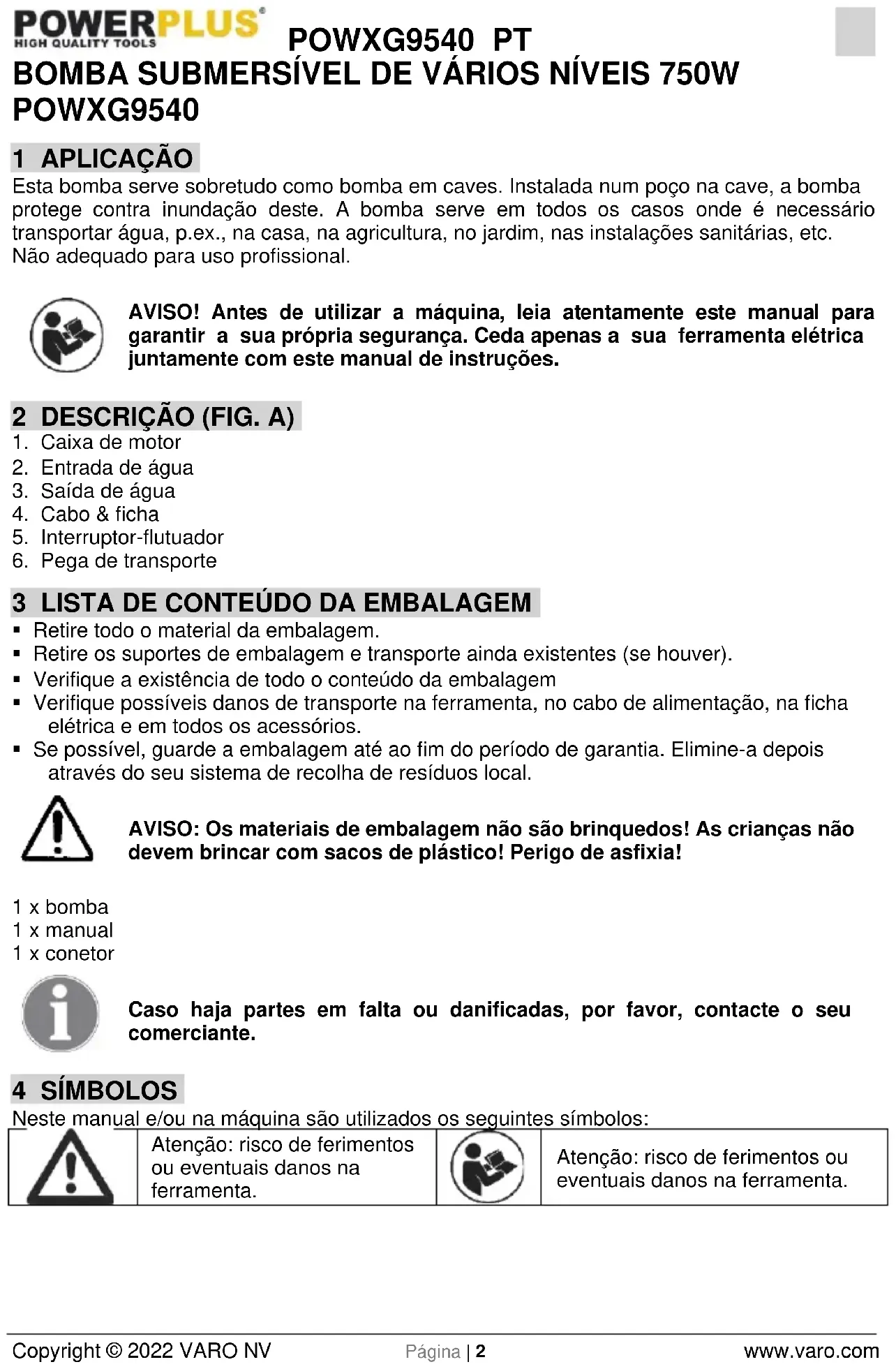 Copyright © 2022 VARO NV Página | 2 www.varo.com BOMBA SUBMERSÍVEL DE VÁRIOS NÍVEIS 750W POWXG9540 1 APLICAÇÃO Esta bomba serve sobretudo como bomba em caves. Instalada num poço na cave, a bomba protege contra inundação deste. A bomba serve em todos os casos onde é necessário transportar água, p.ex., na casa, na agricultura, no jardim, nas instalações sanitárias, etc. Não adequado para uso profissional. AVISO! Antes de utilizar a máquina, leia atentamente este manual para garantir a sua própria segurança. Ceda apenas a sua ferramenta elétrica juntamente com este manual de instruções. 2 DESCRIÇÃO (FIG. A)