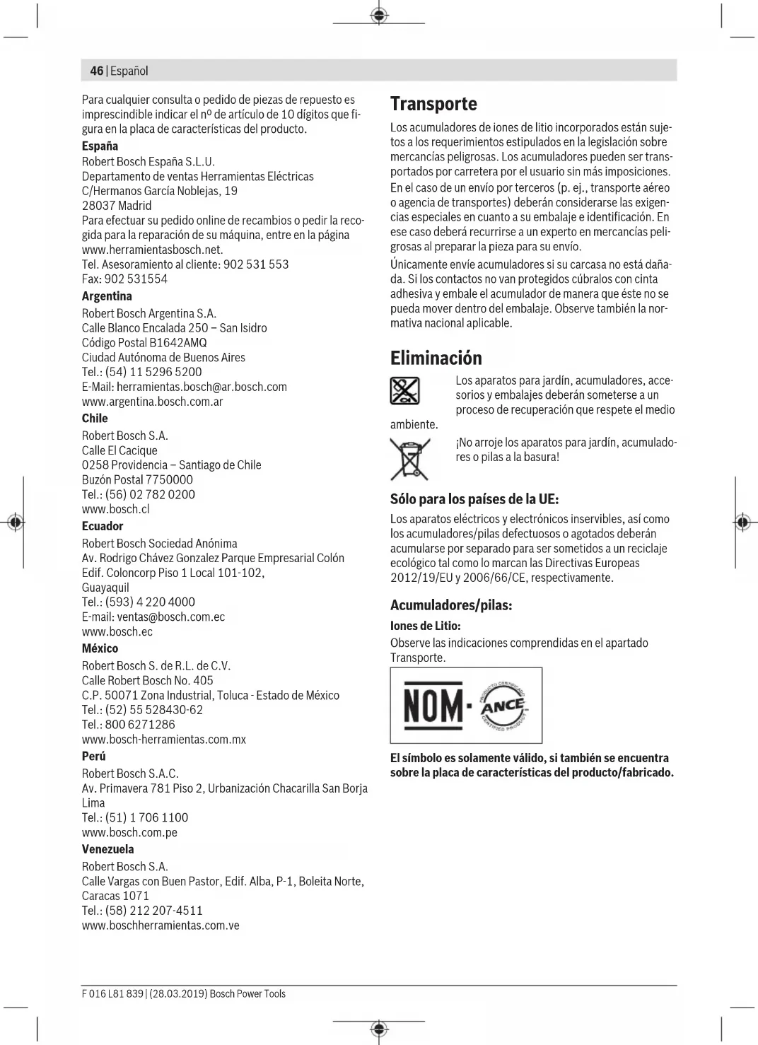 Para aumentar la autonomía puede adquirirse un acumula- dor adicional a través de un servicio técnico de aparatos pa- ra jardín Bosch. Localización de fallos Síntoma Posible causa Solución El motor no funciona Cableado interior de la máquina defectuoso Diríjase a un servicio técnico Bosch Acumulador descargado Recargue el acumulador Acumulador demasiado frío o caliente Dejar que se caliente/enfríe el acumulador Césped demasiado alto Altura máx. del césped 30 cm con el ajuste máxi- mo de la altura de corte El guardamotor se ha activado Dejar que se enfríe el motor y ajustar una altura de corte mayor Disyuntor enchufado de forma incorrecta o in- completa Montarlo correctamente El aparato para jardín funciona de forma in- termitente Cableado interior de la máquina defectuoso Diríjase a un servicio técnico Bosch F 016 L81 839 | (28.03.2019) Bosch Power ToolsEspañol | 45 Síntoma Posible causa Solución El guardamotor se ha activado Dejar que se enfríe el motor y ajustar una altura de corte mayor La altura de corte obte- nida con el aparato de jardín es irregular y/o el motor trabaja con di- ficultad Altura de corte muy baja Ajustar una altura de corte mayor Cuchilla mellada Cambiar cuchilla (ver figura K) Puede que exista una obstrucción Desconectar el aparato para jardín y desenchufar el disyuntor Examine la parte inferior del aparato para jardín y desobstrúyala, si procede (siempre use guantes para jardín) Cuchilla montada al revés Montar la cuchilla en la posición correcta Al conectar el aparato para jardín, la cuchilla de corte no gira Cuchilla obstaculizada por la hierba Desconectar el aparato para jardín y desenchufar el disyuntor Eliminar la obstrucción (siempre use guantes para jardín) Tuerca/tornillo de sujeción de la cuchilla flojos Apretar la tuerca/tornillo de sujeción de la cuchi- lla (22 Nm) Vibraciones o ruidos in- tensos Tuerca/tornillo de sujeción de la cuchilla flojos Apretar la tuerca/tornillo de sujeción de la cuchi- lla (22 Nm) Cuchilla dañada Cambiar cuchilla (ver figura K) Acumulador y cargador Síntomas Posible causa Solución El indicador rojo de carga del acumulador parpadea en el carga- dor No es posible realizar el proceso de carga Acumulador mal montado Montar correctamente el acumulador en el carga- dor Contactos sucios del acumulador Limpiar los contactos del acumulador, p.ej., me- tiéndolo y sacándolo repetidamente, o bien, sus- tituir el acumulador Acumulador defectuoso Sustituir el acumulador Los indicadores de car- ga del acumulador no se encienden en el car- gador El enchufe de red del cargador no está correcta- mente conectado Introducir completamente el enchufe en la toma de corriente Toma de corriente, cable de red o cargador defec- tuoso Verifique la tensión de red, y si fuese preciso, acuda a un servicio técnico autorizado para herra- mientas eléctricas Bosch para hacer revisar el cargador Mantenimiento y servicio Cuidado del acumulador u ¡Atención! Desconecte el aparato para jardín, desen- chufe el disyuntor, y desmonte el acumulador y el saco colector de césped antes de realizar trabajos de man- tenimiento y limpieza. u Póngase siempre unos guantes de protección al mani- pular o trabajar en el área de las cuchillas. Para asegurar un aprovechamiento óptimo del acumulador tenga en cuenta las siguientes indicaciones y medidas: – Proteja el acumulador de la humedad y del agua. – Únicamente almacene el acumulador a una temperatura situada entre -20 °C y 50 °C. No deje, p. ej., el acumula- dor dentro del coche en el verano. – Guarde el acumulador por separado, sin tenerlo montado en el aparato para jardín. – No deje el acumulador en el aparato para jardín si éste es- tuviese directamente expuesto a sol. – La temperatura ideal para almacenar el acumulador es de 5°C. – Limpie de vez en cuando las rejillas de refrigeración del acumulador con un pincel suave, limpio y seco. Si después de haberlo recargado, el tiempo de funciona- miento del acumulador fuese muy corto, ello es síntoma de que está agotado y debe sustituirse. Servicio técnico y atención al cliente www.bosch-garden.com Bosch Power Tools F 016 L81 839 | (28.03.2019)46 | Español Para cualquier consulta o pedido de piezas de repuesto es imprescindible indicar el nº de artículo de 10dígitos que fi- gura en la placa de características del producto. España Robert Bosch España S.L.U. Departamento de ventas Herramientas Eléctricas C/Hermanos García Noblejas, 19 28037 Madrid Para efectuar su pedido online de recambios o pedir la reco- gida para la reparación de su máquina, entre en la página www.herramientasbosch.net. Tel. Asesoramiento al cliente: 902 531 553 Fax: 902 531554 Argentina Robert Bosch Argentina S.A. Calle Blanco Encalada 250 – San Isidro Código Postal B1642AMQ Ciudad Autónoma de Buenos Aires Tel.: (54) 11 5296 5200 E-Mail: herramientas.bosch@ar.bosch.com www.argentina.bosch.com.ar Chile Robert Bosch S.A. Calle El Cacique 0258 Providencia – Santiago de Chile Buzón Postal 7750000 Tel.: (56) 02 782 0200 www.bosch.cl Ecuador Robert Bosch Sociedad Anónima Av. Rodrigo Chávez Gonzalez Parque Empresarial Colón Edif. Coloncorp Piso 1 Local 101-102, Guayaquil Tel.: (593) 4 220 4000 E-mail: ventas@bosch.com.ec www.bosch.ec México Robert Bosch S. de R.L. de C.V. Calle Robert Bosch No. 405 C.P. 50071 Zona Industrial, Toluca - Estado de México Tel.: (52) 55 528430-62 Tel.: 800 6271286 www.bosch-herramientas.com.mx Perú Robert Bosch S.A.C. Av. Primavera 781 Piso 2, Urbanización Chacarilla San Borja Lima Tel.: (51) 1 706 1100 www.bosch.com.pe Venezuela Robert Bosch S.A. Calle Vargas con Buen Pastor, Edif. Alba, P-1, Boleita Norte, Caracas 1071 Tel.: (58) 212 207-4511 www.boschherramientas.com.ve Transporte Los acumuladores de iones de litio incorporados están suje- tos a los requerimientos estipulados en la legislación sobre mercancías peligrosas. Los acumuladores pueden ser trans- portados por carrete