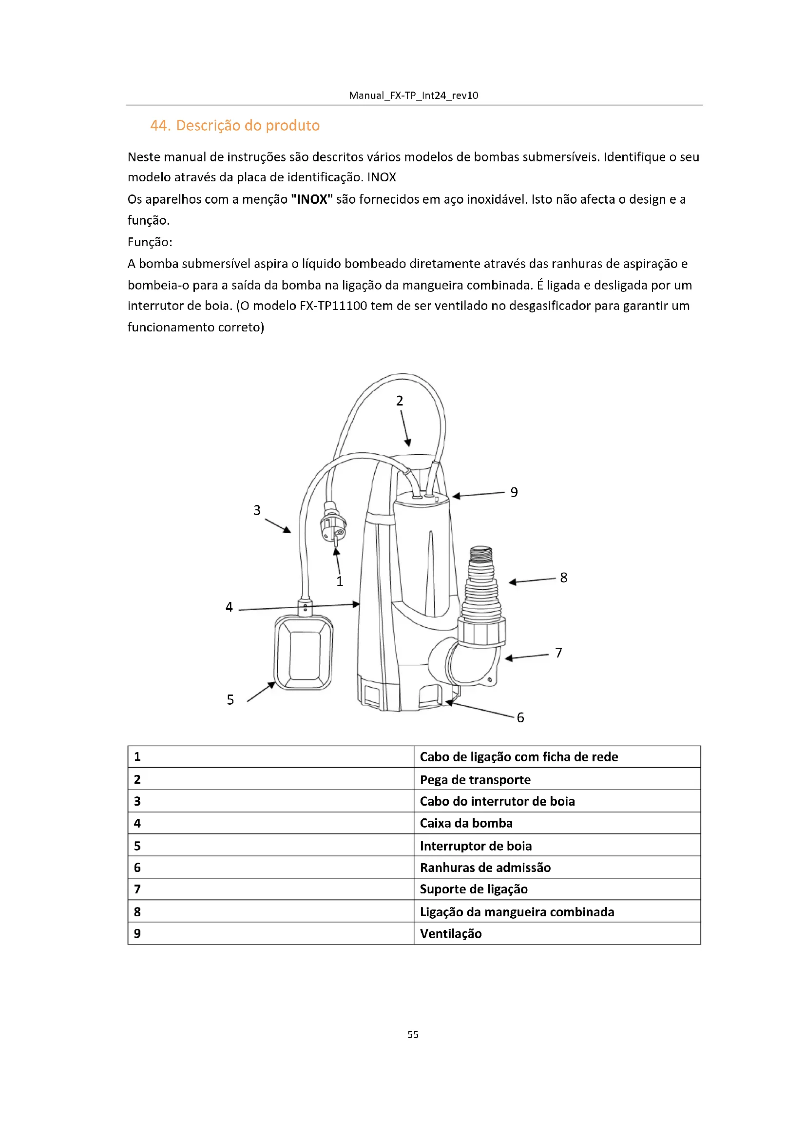 Neste manual de instruções são descritos vários modelos de bombas submersíveis. Identifique o seu modelo através da placa de identificação. INOX Os aparelhos com a menção "INOX" são fornecidos em aço inoxidável. Isto não afecta o design e a função. Função: A bomba submersível aspira o líquido bombeado diretamente através das ranhuras de aspiração e bombeia-o para a saída da bomba na ligação da mangueira combinada. É ligada e desligada por um interrutor de boia. (O modelo FX-TP11100 tem de ser ventilado no desgasificador para garantir um funcionamento correto)