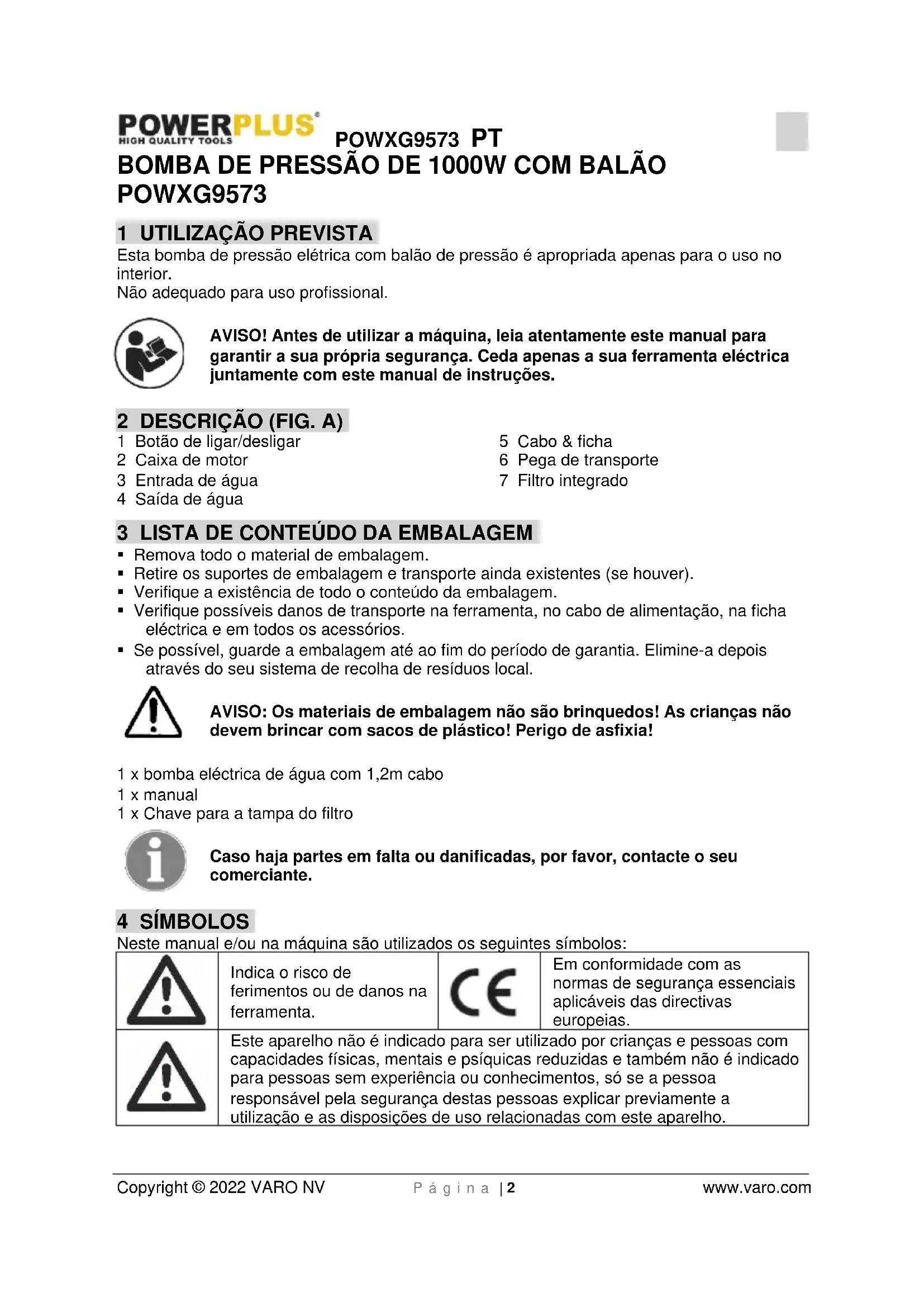 A bomba de água deve estar correctamente ligada à terra. Um curto-circuito fará com os artigos relevantes da garantia fiquem inválidos. Se for necessário aumentar o tamanho do cabo original, deve ser utilizado um com a mesma secção do original. 7 OPERAÇÃO As não são bombas de ferragem automática. Isto significa que, em primeiro lugar, a mangueira de sucção deve ser instalada com: 1 A válvula de retenção com filtro; Esta válvula assegura que, após a bomba ser desligada, a mangueira e a bomba não funcionam em seco. Esta parte da mangueira bloqueia a água que está a ser bombeada.POWXG9573 PT Copyright © 2022 VARO NV P á g i n a | 4 www.varo.com 2 A ligação da mangueira com porca de união; Esta extremidade da mangueira é ligada na parte frontal da bomba. 3 Ambos os acessórios devem ser devidamente fixados na mangueira, através da braçadeira. Antes de fixar a mangueira na bomba, é aconselhável enchê-la primeiro com água. Após este procedimento, pode instalar a torneira de três vias ou outro conector de 25mm (1") na saída que se encontra na parte superior da bomba. Em seguida, deve encher a caixa da bomba com água através do orifício incorporado e voltar a vedá-la. Após a bomba e a mangueira estarem cheias com água, pode ligar a bomba utilizando o interruptor. A bomba começa, de ¡mediato, a bombear a água (no caso da versão auto, o tanque de pressão é cheio em primeiro lugar, o que implica que demorará alguns segundos até a água começar a sair da mangueira que se encontra ligada). Após a bomba ser desligada, a água permanece na bomba e na mangueira. Isto significa que, da próxima vez que for ligada, a água começa de ¡mediato a ser bombeada. Se não estiver instalada qualquer válvula de retorno ou se o vedante entre a válvula e a mangueira não estiver a funcionar correctamente (braçadeira!), pode começar a funcionar em seco e a bomba deve voltar a ser cheia para funcionar correctamente.