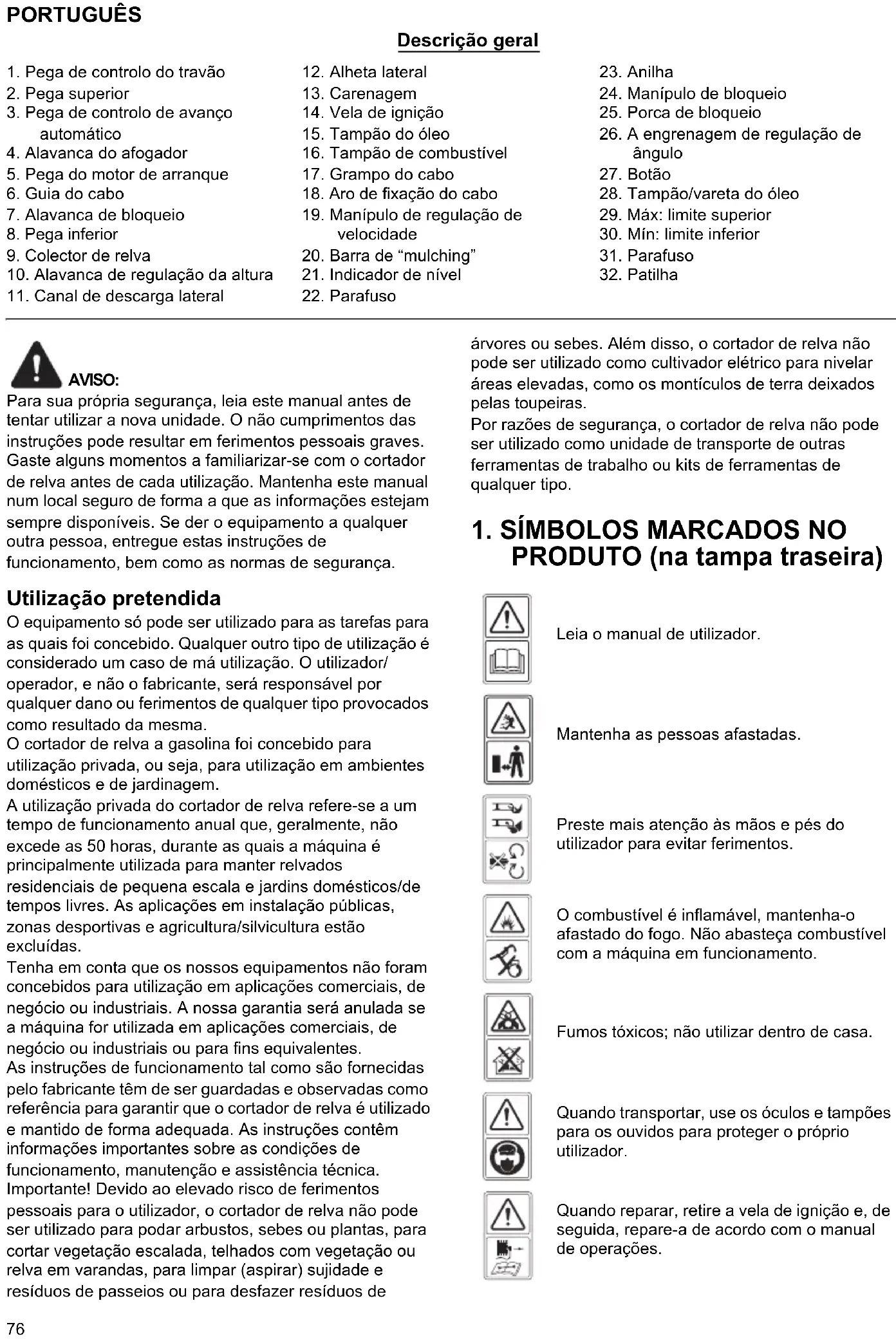 Leia o manual de utilizador. Mantenha as pessoas afastadas. Preste mais atenção às mãos e pés do utilizador para evitar ferimentos. O combustível é inflamável, mantenha-o afastado do fogo. Não abasteça combustível com a máquina em funcionamento. Fumos tóxicos; não utilizar dentro de casa. Quando transportar, use os óculos e tampões para os ouvidos para proteger o próprio utilizador. Quando reparar, retire a vela de ignição e, de seguida, repare-a de acordo com o manual de operações.77