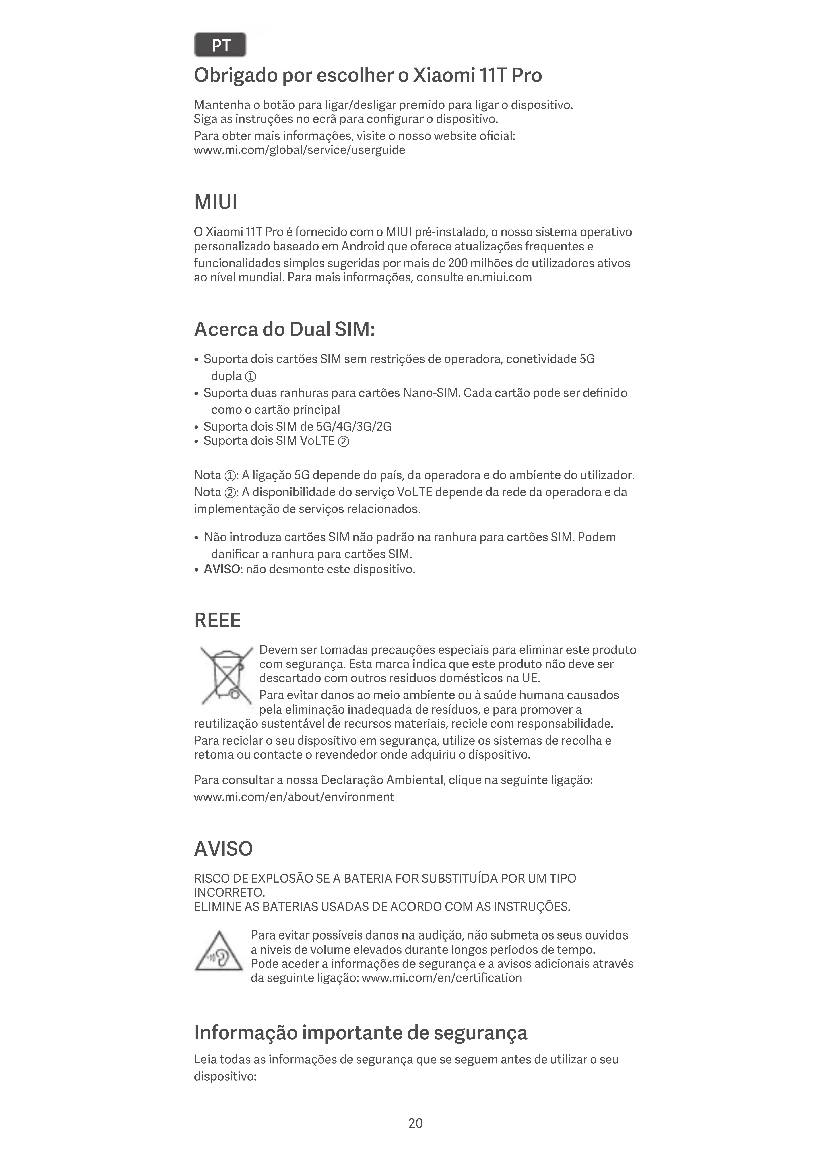 - AVISO: não desmonte este dispositivo. REEE Devem ser tomadas precauções especiais para eliminar este produto com segurança. Esta marca indica que este produto não deve ser descartado com outros resíduos domésticos na UE. Para evitar danos ao meio ambiente ou à saúde humana causados pela eliminação inadequada de resíduos, e para promover a reutilização sustentável de recursos materiais, recicle com responsabilidade. Para reciclar o seu dispositivo em segurança, utilize os sistemas de recolha e retoma ou contacte o revendedor onde adquiriu o dispositivo. Para consultar a nossa Declaração Ambiental, clique na seguinte ligação: www.mi.com/en/about/environment AVISO RISCO DE EXPLOSÃO SE A BATERIA FOR SUBSTITUÍDA POR UM TIPO INCORRETO. ELIMINE AS BATERIAS USADAS DE ACORDO COM AS INSTRUÇÕES. Para evitar possíveis danos na audição, não submeta os seus ouvidos a níveis de volume elevados durante longos períodos de tempo. Pode aceder a informações de segurança e a avisos adicionais através da seguinte ligação: www.mi.com/en/certification Informação importante de segurança Leia todas as informações de segurança que se seguem antes de utilizar o seu dispositivo: 20• Utilizar cabos, transformadores ou baterias não autorizados pode provocar incêndios, explosões ou outros riscos.