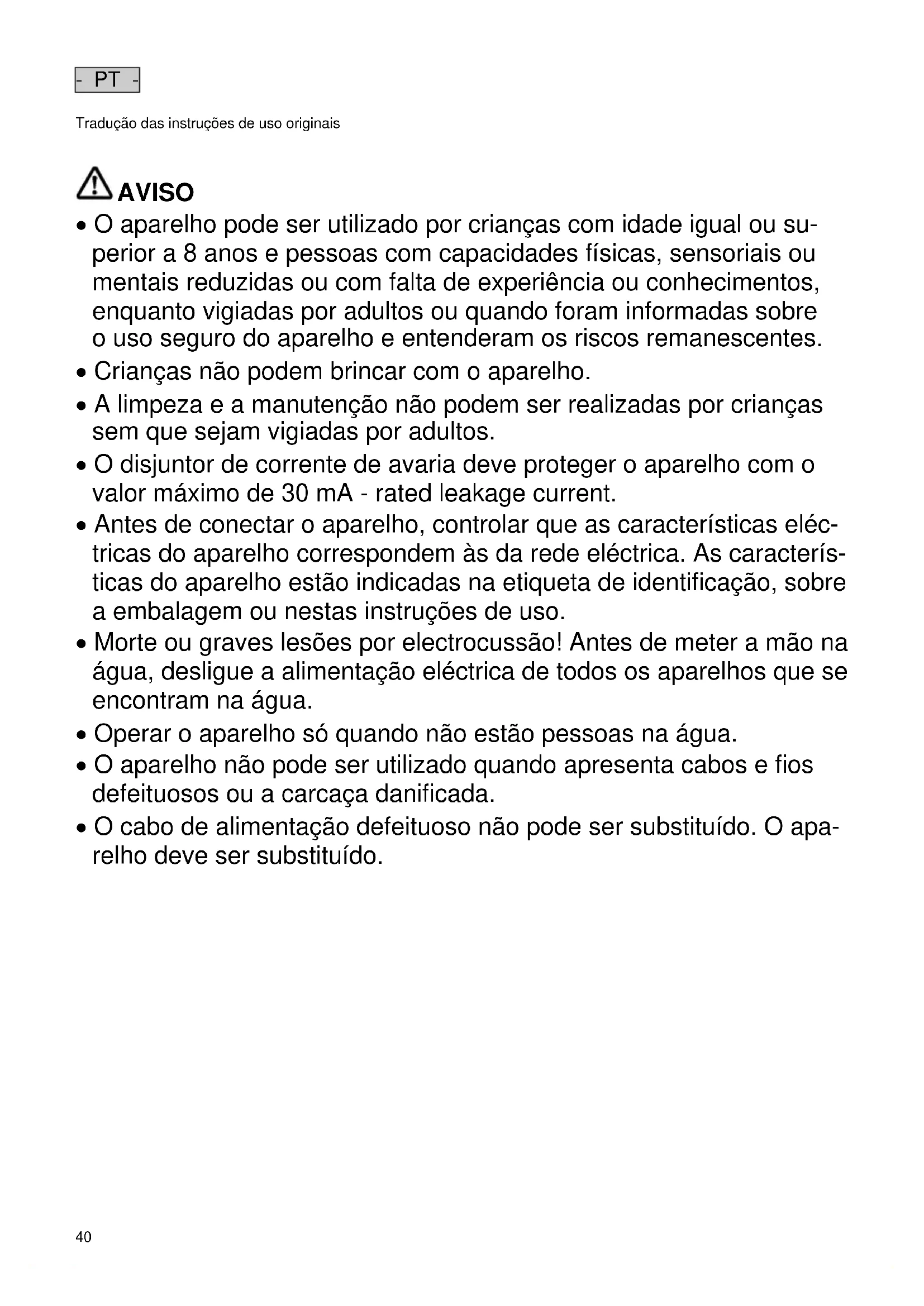 AVISO AVISO O aparelho pode ser utilizado por crianças com idade igual ou su- perior a 8 anos e pessoas com capacidades físicas, sensoriais ou mentais reduzidas ou com falta de experiência ou conhecimentos, enquanto vigiadas por adultos ou quando foram informadas sobre o uso seguro do aparelho e entenderam os riscos remanescentes. Crianças não podem brincar com o aparelho. A limpeza e a manutenção não podem ser realizadas por crianças sem que sejam vigiadas por adultos. O disjuntor de corrente de avaria deve proteger o aparelho com o valor máximo de 30 mA - rated leakage current. Antes de conectar o aparelho, controlar que as características eléc- tricas do aparelho correspondem às da rede eléctrica. As caracterís- ticas do aparelho estão indicadas na etiqueta de identificação, sobre a embalagem ou nestas instruções de uso. Morte ou graves lesões por electrocussão! Antes de meter a mão na água, desligue a alimentação eléctrica de todos os aparelhos que se encontram na água. Operar o aparelho só quando não estão pessoas na água. O aparelho não pode ser utilizado quando apresenta cabos e fios defeituosos ou a carcaça danificada. O cabo de alimentação defeituoso não pode ser substituído. O apa- relho deve ser substituído.- PT -