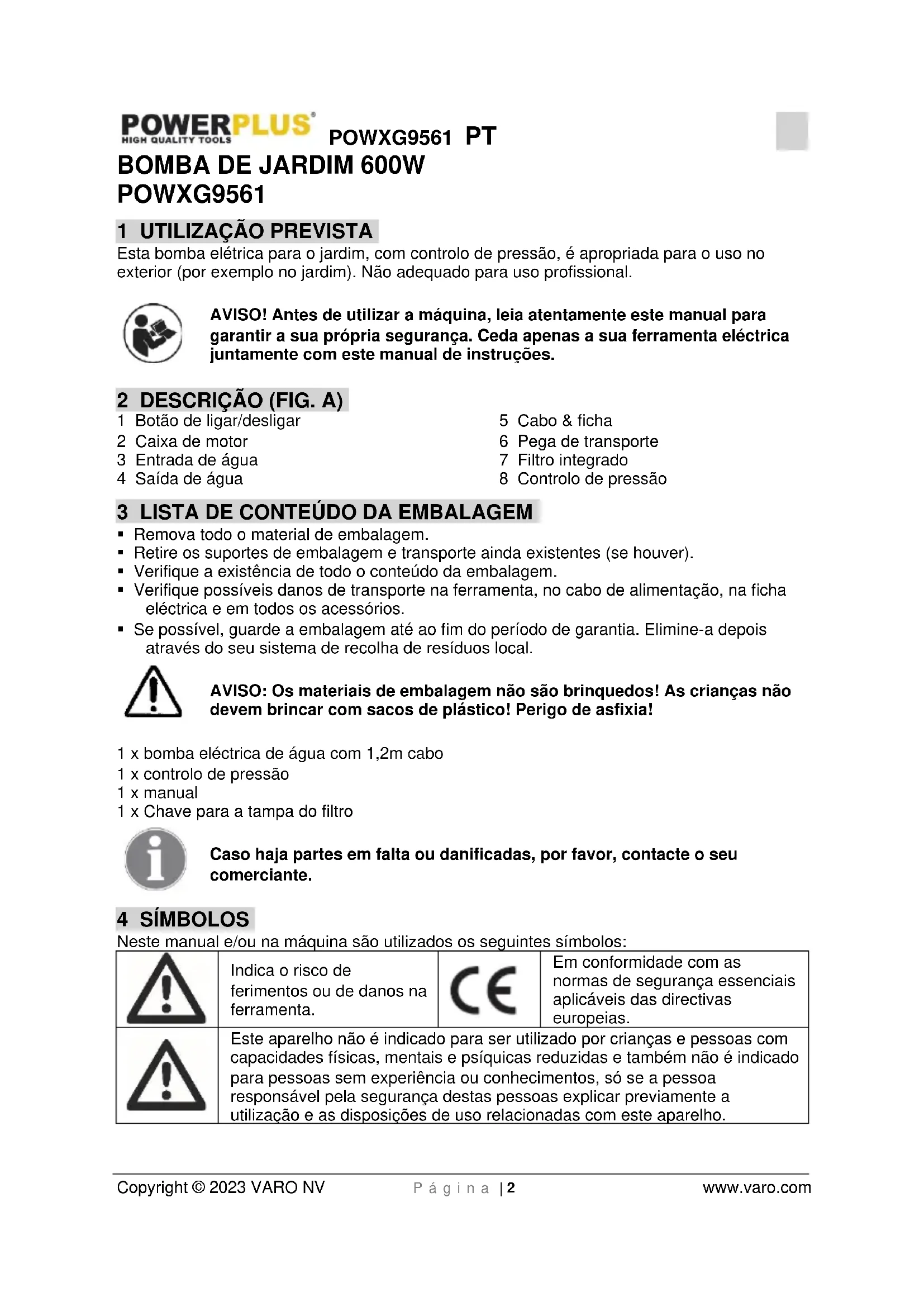 - A bomba não é adequada para utilização em piscinas ou lagos ou em situações em que as pessoas podem entrar em contacto com a água e, assim, não deve ser utilizada nestas condições.POWXG9561 PT Copyright © 2023 VARO NV P á g i n a | 5 www.varo.com