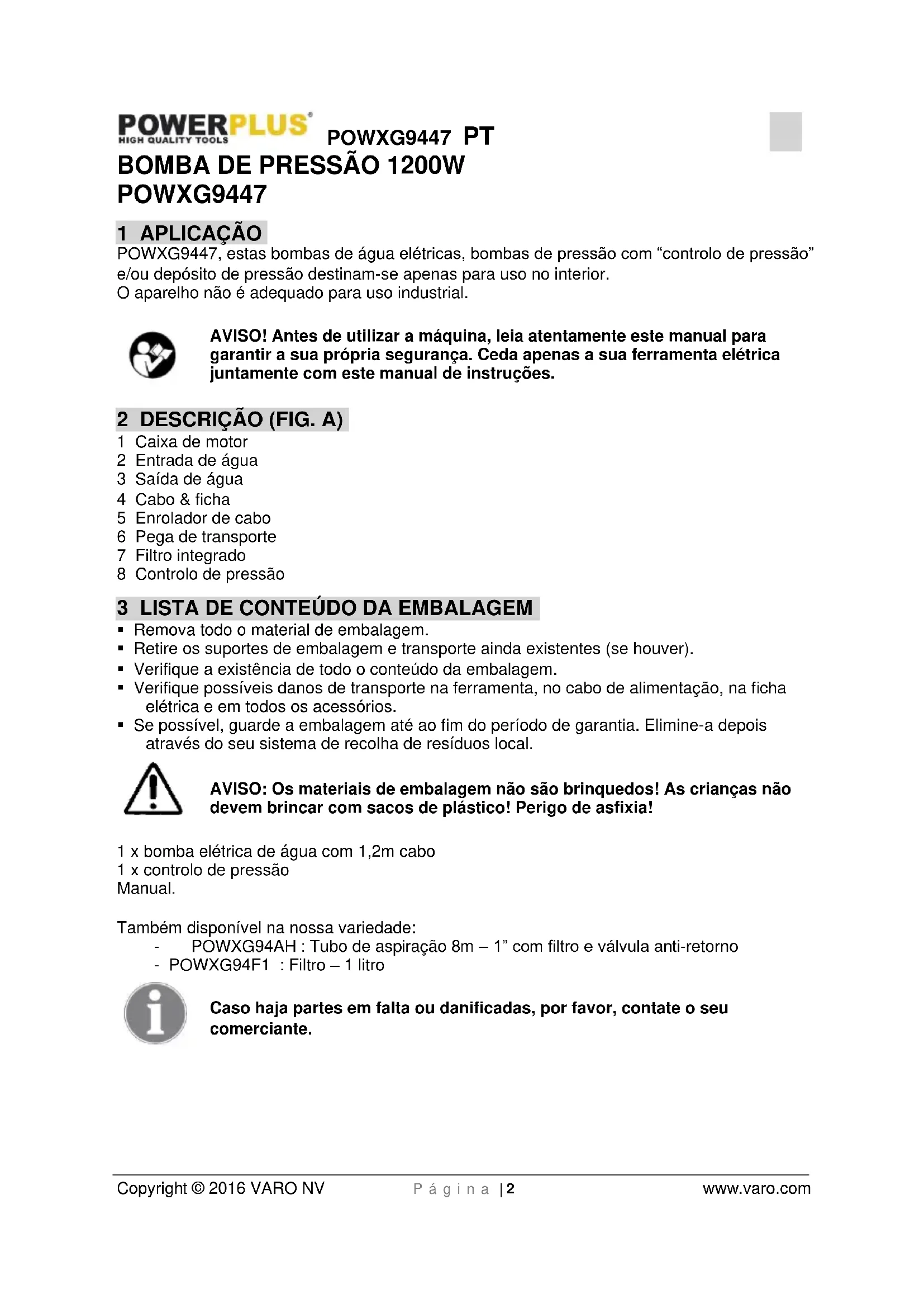 VARO N.V. – Joseph Van Instraat 9 – BE2500 Lier – Bélgica, declara que, Designação do aparelho: Bomba De Pressão Marca: POWERplus Modelo nº.: POWXG9447 se encontra em conformidade com os requisitos essenciais e outras provisões relevantes das Diretivas Comunitárias aplicáveis, com base na aplicação das normas Europeias harmonizadas. Qualquer alteração não autorizada do equipamento anula esta declaração. Diretivas Europeias (incluindo, se aplicável, as respetivas emendas até à data de assinatura); 2011/65/EU 2006/95/CE 2004/108/CE 2000/14/CE Annex V LwA 81dB(A) / 84dB(A) Normas Europeias harmonizadas (incluindo, se aplicável, as respetivas emendas até à data de assinatura); EN60335-1 : 2012 EN60335-2-41 : 2003 EN55014-1 : 2006 EN55014-2 : 1997 EN61000-3-2 : 2006 EN61000-3-3 : 2013 Detentor da Documentação Técnica: Philippe Vankerkhove, VARO – Vic. Van Rompuy N.V. O signatário atua em nome da administração da empresa, Hugo Cuypers Assuntos Regulamentares – Gestor de Conformidade 26/06/2015POWXG9447 NO Copyright © 2016 VARO NV S i d e | 1 www.varo.com 1 BRUKSOMRÅDE ............................................................................... 2