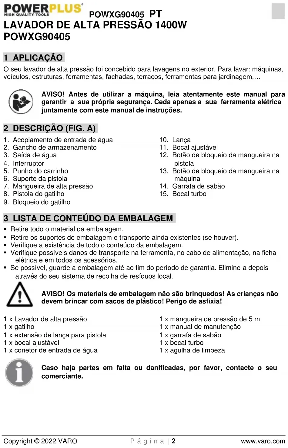 - Se possível, guarde a embalagem até ao fim do período de garantia. Elimine-a depois através do seu sistema de recolha de resíduos local. AVISO! Os materiais de embalagem não são brinquedos! As crianças não devem brincar com sacos de plástico! Perigo de asfixia! 1 x Lavador de alta pressão 1 x gatilho 1 x extensão de lança para pistola 1 x bocal ajustável 1 x conetor de entrada de água 1 x mangueira de pressão de 5 m 1 x manual de manutenção 1 x garrafa de sabão 1 x bocal turbo 1 x agulha de limpeza Caso haja partes em falta ou danificadas, por favor, contacte o seu comerciante.POWXG90405 PT Copyright © 2022 VARO P á g i n a | 3 www.varo.com 4 INSTRUÇÕES ADICIONAIS PARA OS LIMPADORES DE ALTA PRESSÃO
