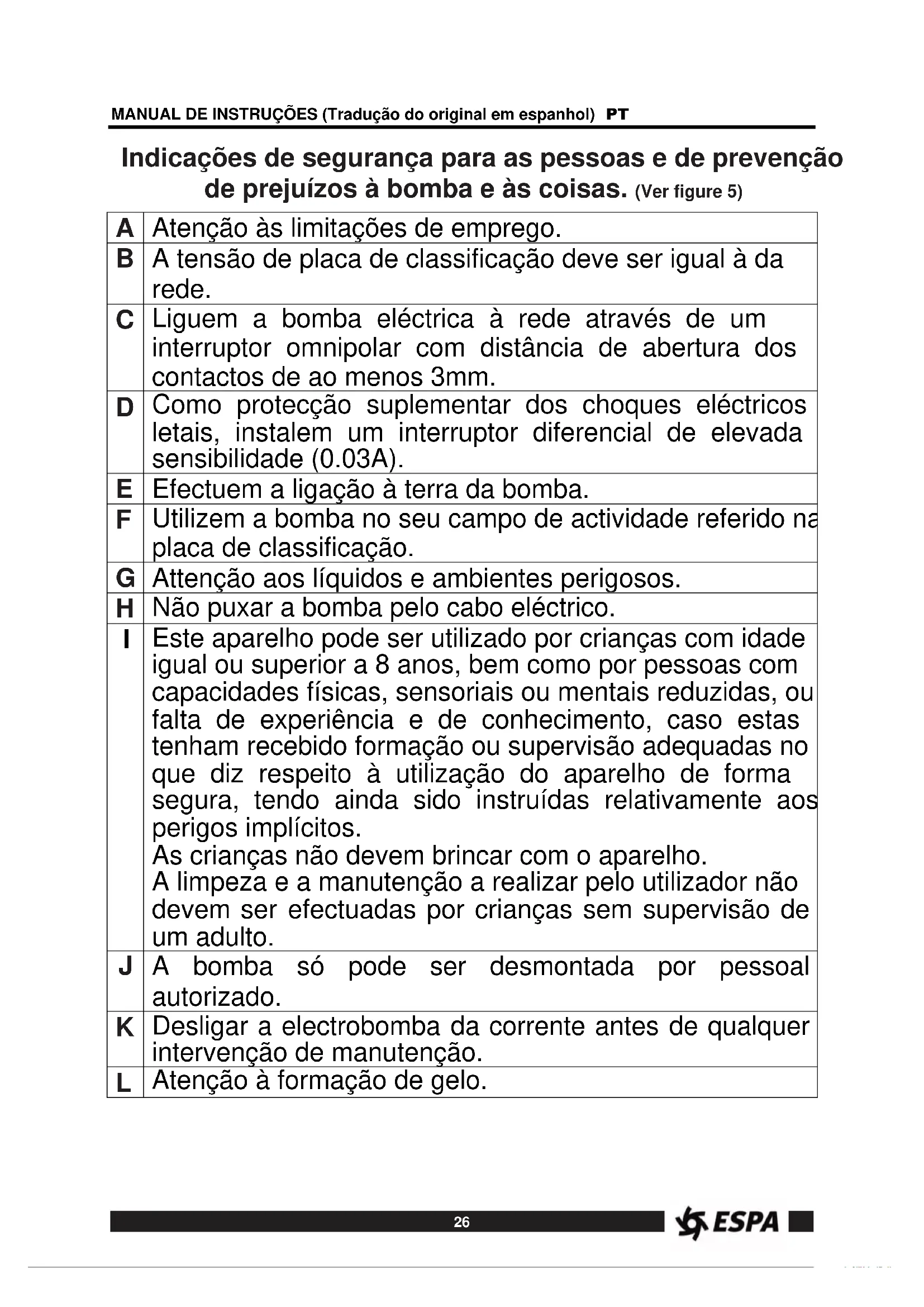 Tubatura di mandata difettosa Sostituire detta tubatura con un’altra nuova26 MANUAL DE INSTRUÇÕES (Tradução do original em espanhol) PT Indicações de segurança para as pessoas e de prevenção de prejuízos à bomba e às coisas. (Ver figure 5)