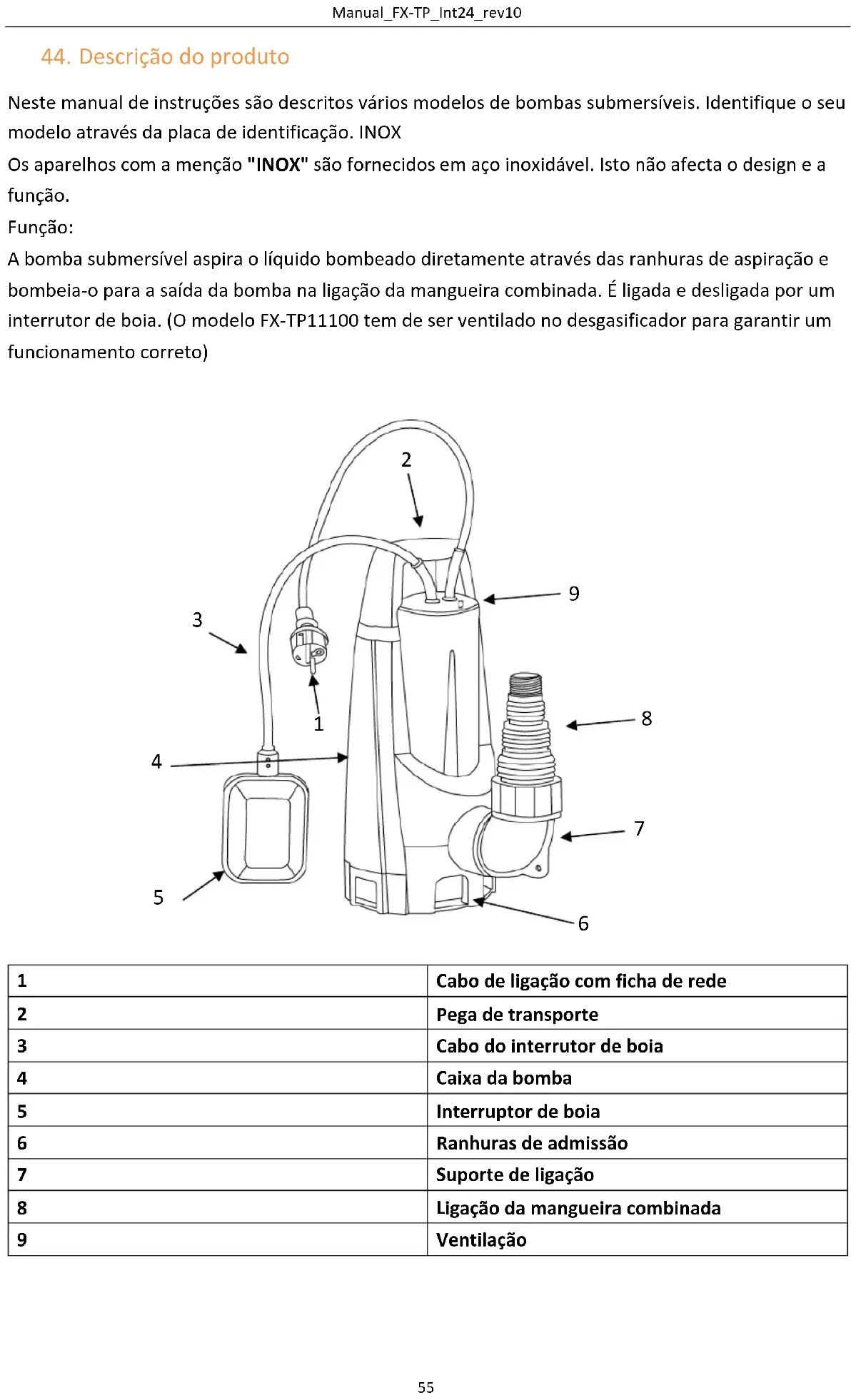 Neste manual de instruções são descritos vários modelos de bombas submersíveis. Identifique o seu modelo através da placa de identificação. INOX Os aparelhos com a menção "INOX" são fornecidos em aço inoxidável. Isto não afecta o design e a função. Função: A bomba submersível aspira o líquido bombeado diretamente através das ranhuras de aspiração e bombeia-o para a saída da bomba na ligação da mangueira combinada. É ligada e desligada por um interrutor de boia. (O modelo FX-TP11100 tem de ser ventilado no desgasificador para garantir um funcionamento correto)