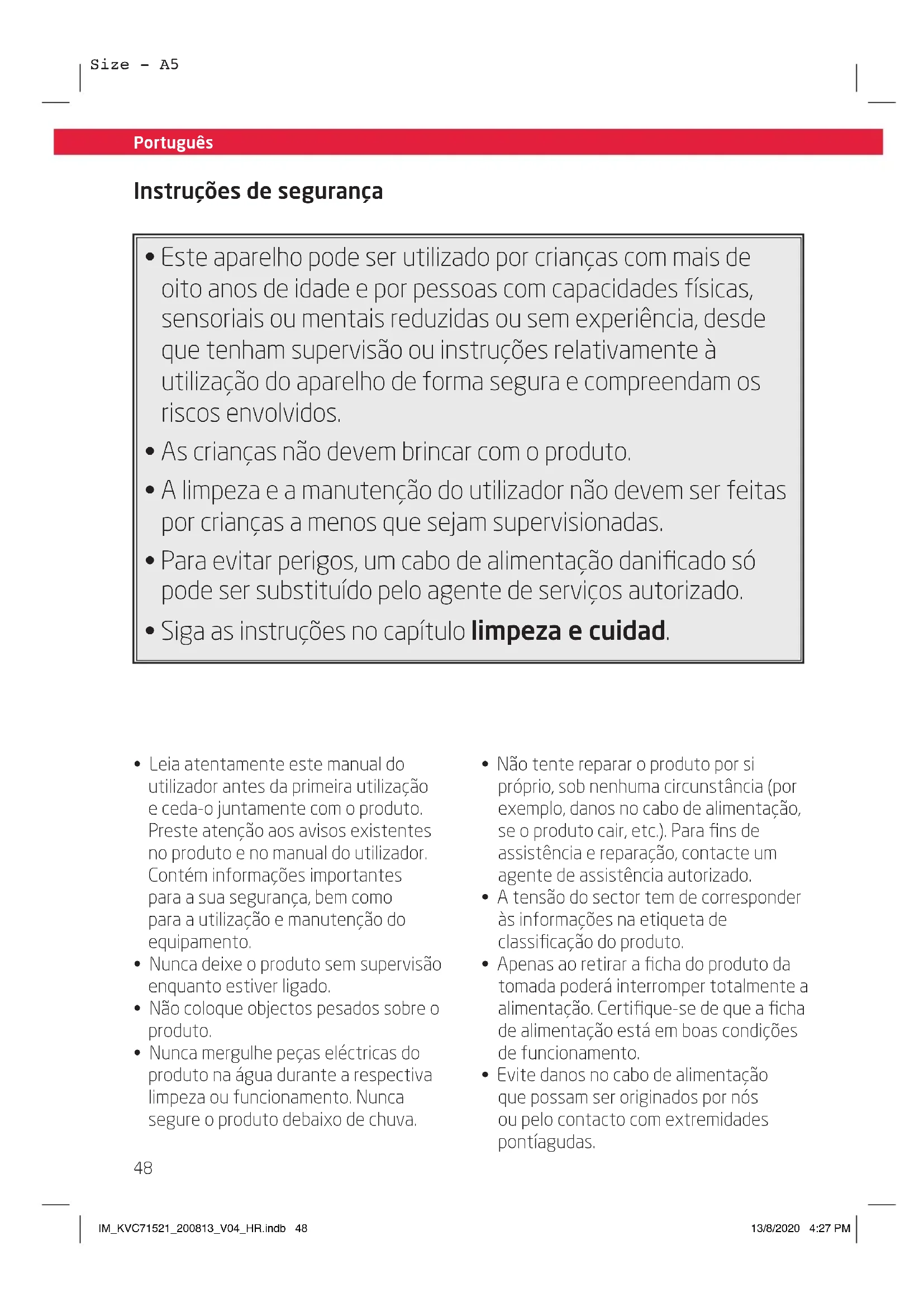 - Evite danos no cabo de alimentação que possam ser originados por nós ou pelo contacto com extremidades pontíagudas. IM_KVC71521_200813_V04_HR.indb 48IM_KVC71521_200813_V04_HR.indb 48 13/8/2020 4:27 PM13/8/2020 4:27 PMPortuguês