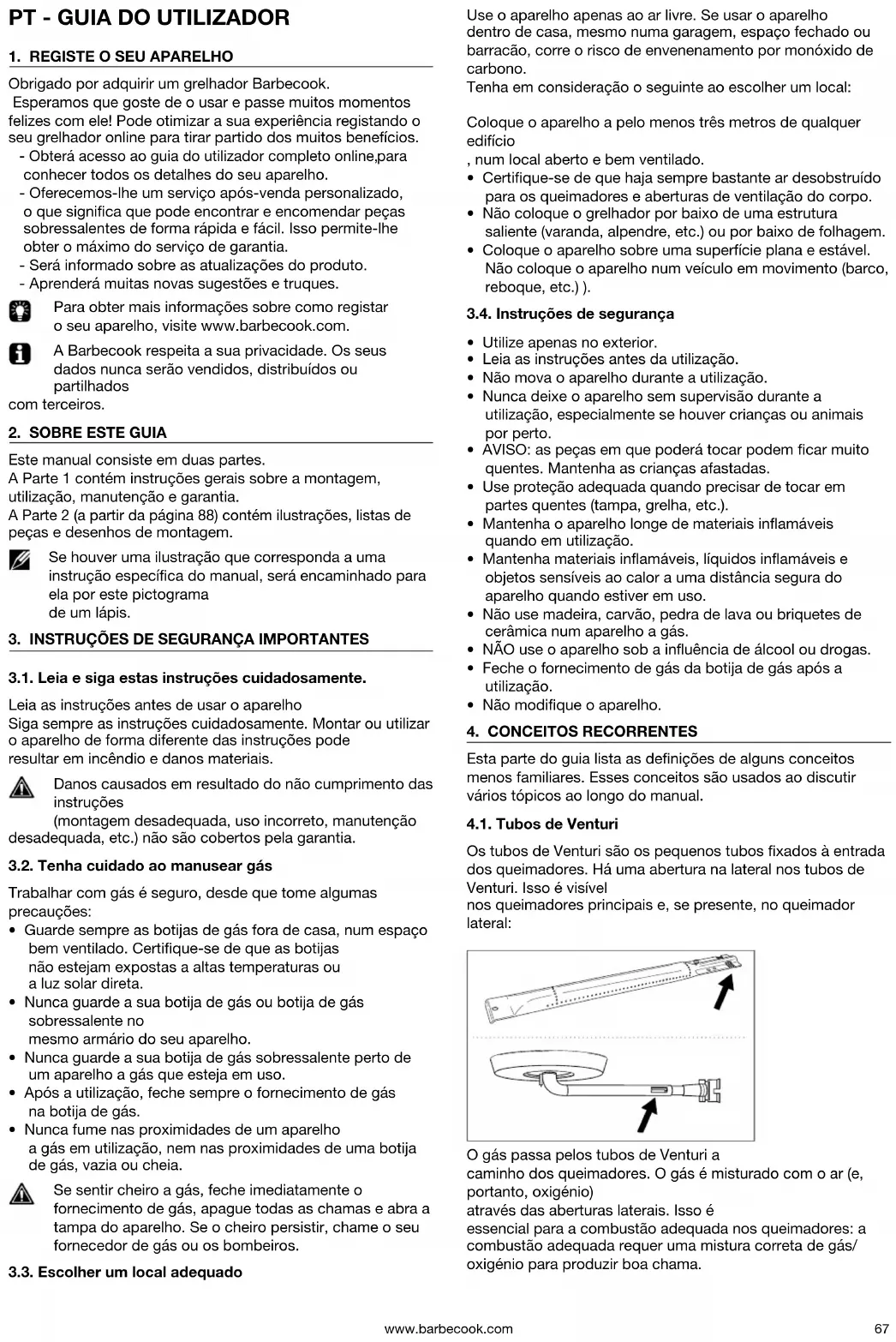 Esta parte do guia lista as denições de alguns conceitos menos familiares. Esses conceitos são usados ao discutir vários tópicos ao longo do manual. 4.1. Tubos de Venturi Os tubos de Venturi são os pequenos tubos xados à entrada dos queimadores. Há uma abertura na lateral nos tubos de Venturi. Isso é visível nos queimadores principais e, se presente, no queimador lateral: O gás passa pelos tubos de Venturi a caminho dos queimadores. O gás é misturado com o ar (e, portanto, oxigénio) através das aberturas laterais. Isso é essencial para a combustão adequada nos queimadores: a combustão adequada requer uma mistura correta de gás/ oxigénio para produzir boa chama.www.barbecook.com