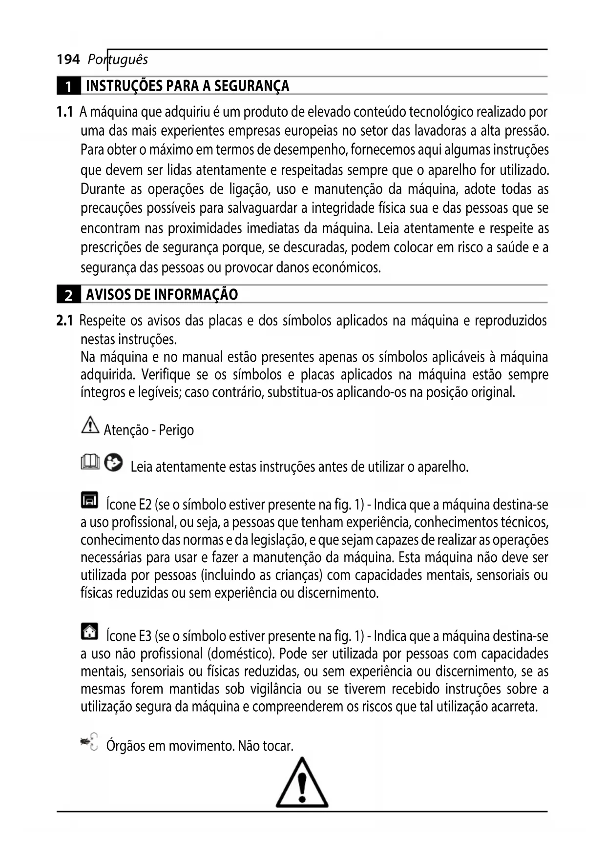 nestas instruções. Na máquina e no manual estão presentes apenas os símbolos aplicáveis à máquina adquirida. Verifique se os símbolos e placas aplicados na máquina estão sempre íntegros e legíveis; caso contrário, substitua-os aplicando-os na posição original. Atenção - Perigo Leia atentamente estas instruções antes de utilizar o aparelho. Ícone E2 (se o símbolo estiver presente na fig. 1) - Indica que a máquina destina-se a uso profissional, ou seja, a pessoas que tenham experiência, conhecimentos técnicos, conhecimento das normas e da legislação, e que sejam capazes de realizar as operações necessárias para usar e fazer a manutenção da máquina. Esta máquina não deve ser utilizada por pessoas (incluindo as crianças) com capacidades mentais, sensoriais ou físicas reduzidas ou sem experiência ou discernimento. Ícone E3 (se o símbolo estiver presente na fig. 1) - Indica que a máquina destina-se a uso não profissional (doméstico). Pode ser utilizada por pessoas com capacidades mentais, sensoriais ou físicas reduzidas, ou sem experiência ou discernimento, se as mesmas forem mantidas sob vigilância ou se tiverem recebido instruções sobre a utilização segura da máquina e compreenderem os riscos que tal utilização acarreta. Órgãos em movimento. Não tocar.195Português 0 Posição de interruptor desligado