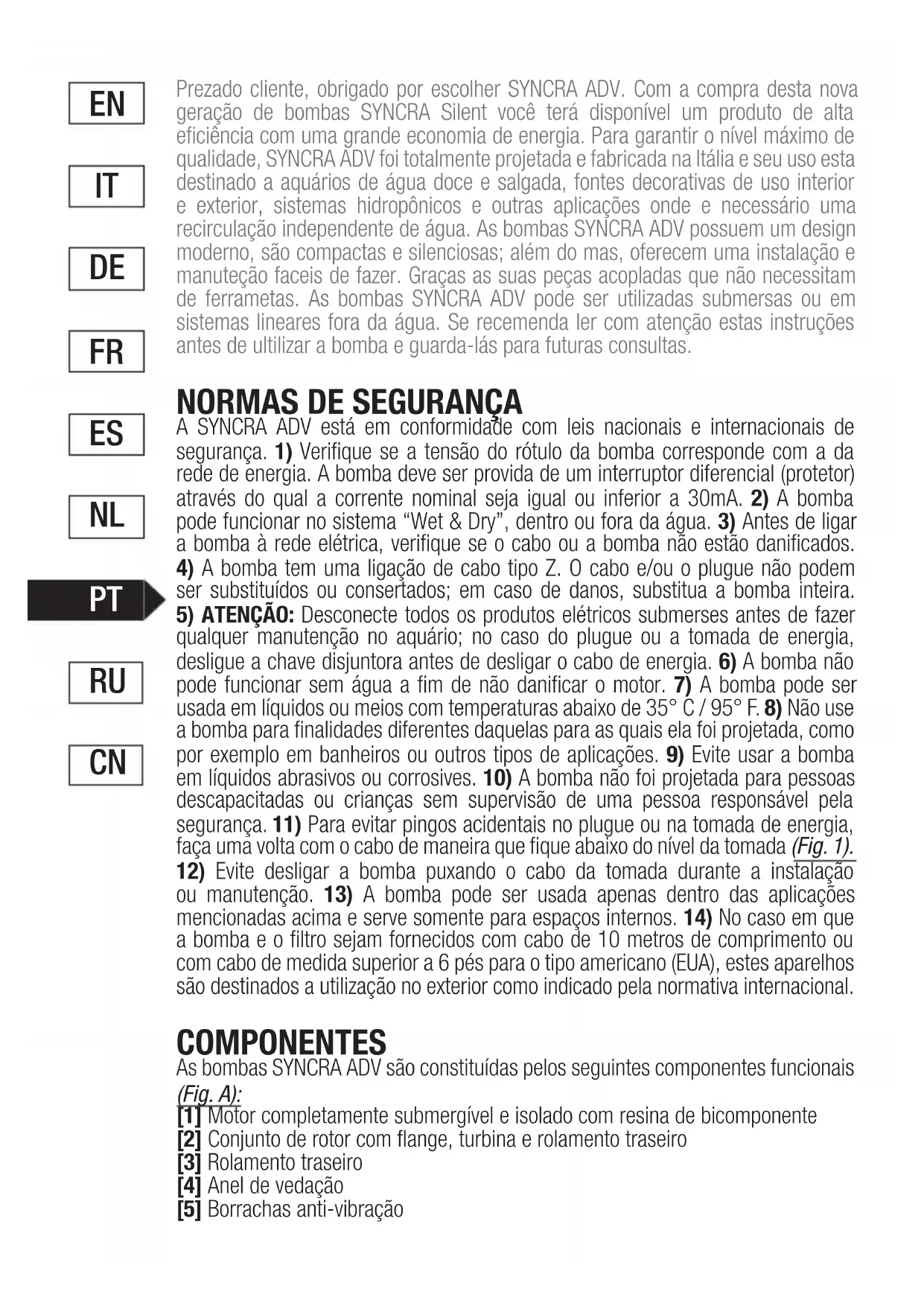 ou manutenção. 13) A bomba pode ser usada apenas dentro das aplicações mencionadas acima e serve somente para espaços internos. 14) No caso em que a bomba e o filtro sejam fornecidos com cabo de 10 metros de comprimento ou com cabo de medida superior a 6 pés para o tipo americano (EUA), estes aparelhos são destinados a utilização no exterior como indicado pela normativa internacional. COMPONENTES As bombas SYNCRA ADV são constituídas pelos seguintes componentes funcionais (Fig. A): [1] Motor completamente submergível e isolado com resina de bicomponente [2] Conjunto de rotor com flange, turbina e rolamento traseiro [3] Rolamento traseiro [4] Anel de vedação [5] Borrachas anti-vibração