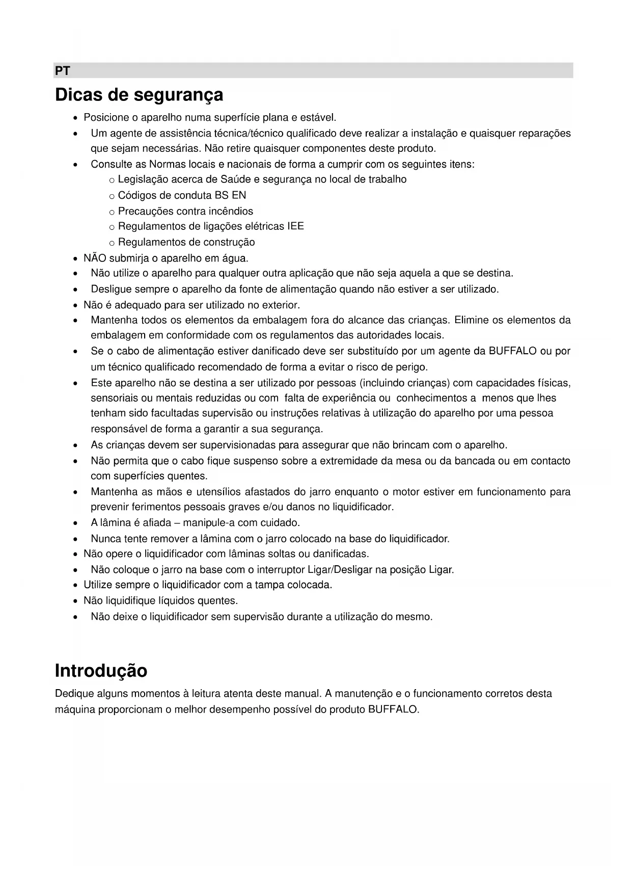 Reservados todos los derechos. Prohibida la reproducción o transmisión en cualquier forma o por cualquier medio, tanto electrónico como mecánico, de fotocopiado, grabación o de otro tipo, de ninguna parte de estas instrucciones sin la autorización previa y por escrito de BUFFALO. Se han realizado los máximos esfuerzos para garantizar que todos los datos son correctos en el momento de su impresión; sin embargo, BUFFALO se reserva el derecho a modificar las especificaciones sin previo aviso.PT Dicas de segurança Posicione o aparelho numa superfície plana e estável. Um agente de assistência técnica/técnico qualificado deve realizar a instalação e quaisquer reparações que sejam necessárias. Não retire quaisquer componentes deste produto. Consulte as Normas locais e nacionais de forma a cumprir com os seguintes itens: o Legislação acerca de Saúde e segurança no local de trabalho o Códigos de conduta BS EN o Precauções contra incêndios o Regulamentos de ligações elétricas IEE o Regulamentos de construção NÃO submirja o aparelho em água. Não utilize o aparelho para qualquer outra aplicação que não seja aquela a que se destina. Desligue sempre o aparelho da fonte de alimentação quando não estiver a ser utilizado. Não é adequado para ser utilizado no exterior. Mantenha todos os elementos da embalagem fora do alcance das crianças. Elimine os elementos da embalagem em conformidade com os regulamentos das autoridades locais. Se o cabo de alimentação estiver danificado deve ser substituído por um agente da BUFFALO ou por um técnico qualificado recomendado de forma a evitar o risco de perigo. Este aparelho não se destina a ser utilizado por pessoas (incluindo crianças) com capacidades físicas, sensoriais ou mentais reduzidas ou com falta de experiência ou conhecimentos a menos que lhes tenham sido facultadas supervisão ou instruções relativas à utilização do aparelho por uma pessoa responsável de forma a garantir a sua segurança. As crianças devem ser supervisionadas para assegurar que não brincam com o aparelho. Não permita que o cabo fique suspenso sobre a extremidade da mesa ou da bancada ou em contacto com superfícies quentes. Mantenha as mãos e utensílios afastados do jarro enquanto o motor estiver em funcionamento para prevenir ferimentos pessoais graves e/ou danos no liquidificador. A lâmina é afiada – manipule-a com cuidado. Nunca tente remover a lâmina com o jarro colocado na base do liquidificador. Não opere o liquidificador com lâminas soltas ou danificadas. Não coloque o jarro na base com o interruptor Ligar/Desligar na posição Ligar. Utilize sempre o liquidificador com a tampa colocada. Não liquidifique líquidos quentes. Não deixe o liquidificador sem supervisão durante a utilização do mesmo. Introdução Dedique alguns momentos à leitura atenta deste manual. A manutenção e o funcionamento corretos desta máquina proporcionam o melhor desempenho possível do produto BUFFALO.PT Conteúdos da embalagem Estão incluídos os seguintes itens: Liquidificador BUFFALO Liquidificador, jarro e tampa. Empurrador de segurança. A BUFFALO orgulha-se da qualidade e serviço que disponibiliza, garantindo que no momento da embalagem os conteúdos são fornecidos totalmente operacionais e sem quaisquer danos. No caso de encontrar qualquer dano resultante do transporte do produto, contacte o revendedor da BUFFALO de imediato. Localização dos controlos
