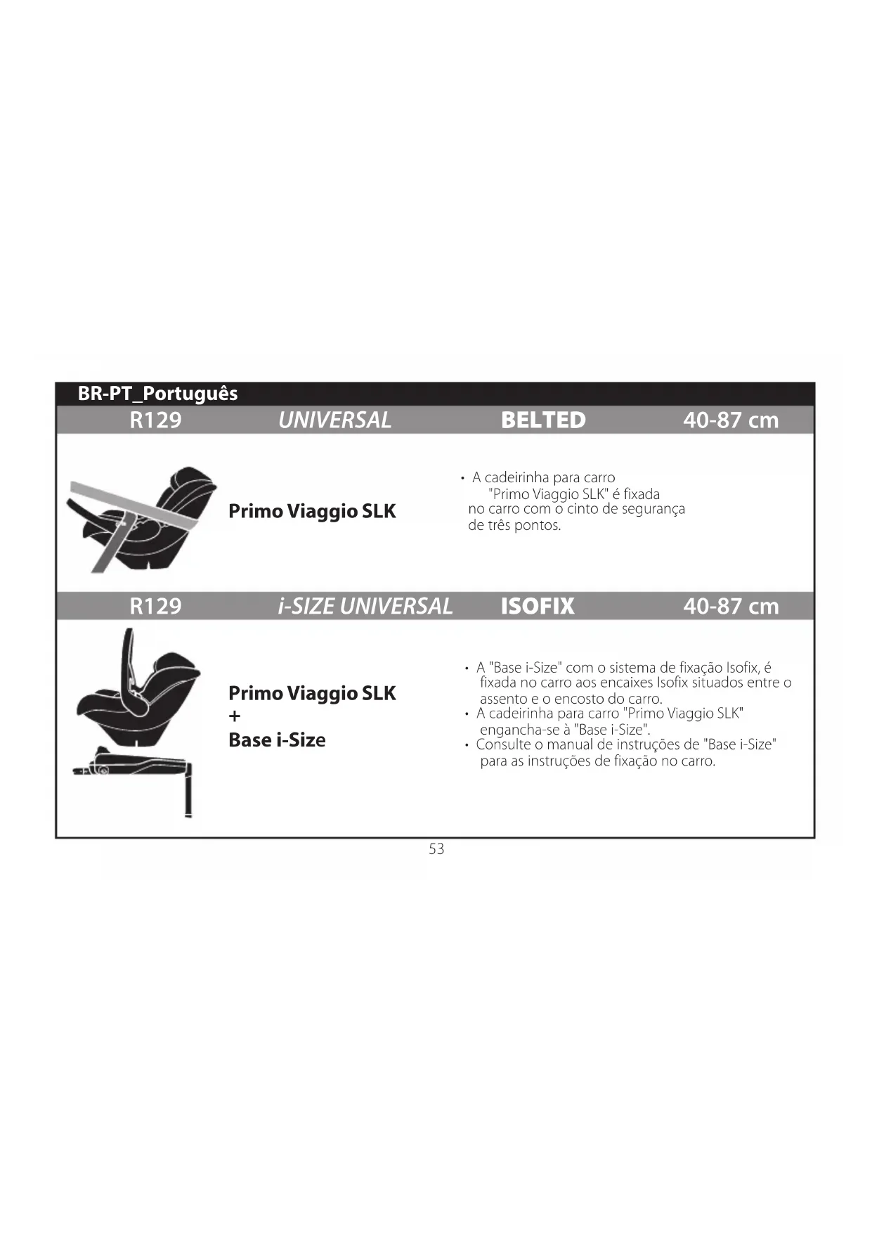 E-mail: info@burigotto.com.br - www.burigotto.com.br tel. 0039/039/60.88.213 e-mail: customer.service@pegperego.com sítio internet: www.pegperego.com Todos os direitos de propriedade intelectual relativos aos conteúdos deste manual de instruções pertencem à Peg Perego S.p.A. e estão protegidos pelas leis vigentes.61 R129 UNIVERSAL BELTED 40-87 cm R129 i-SIZE UNIVERSAL ISOFIX 40-87 cm Primo Viaggio SLK Primo Viaggio SLK