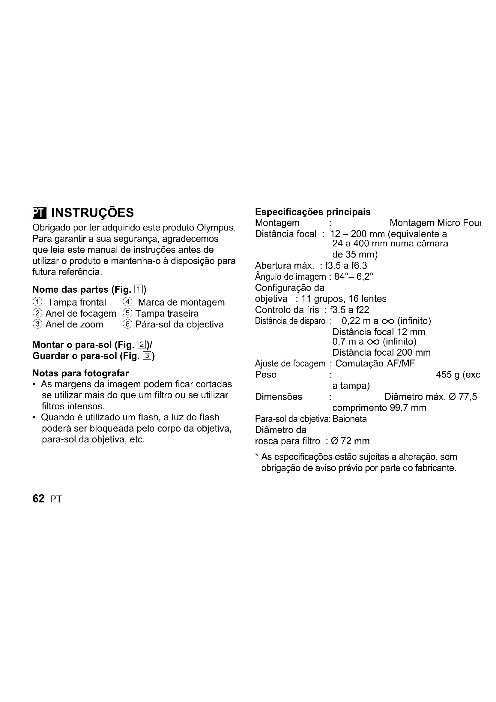 - Quando é utilizado um flash, a luz do flash poderá ser bloqueada pelo corpo da objetiva, para-sol da objetiva, etc. Especificações principais Montagem : Montagem Micro Four Thirds Distância focal : 12 – 200 mm (equivalente a 24 a 400 mm numa câmara de 35 mm) Abertura máx. : f3.5 a f6.3 Ângulo de imagem : 84°– 6,2° Configuração da objetiva : 11 grupos, 16 lentes Controlo da íris : f3.5 a f22 Distância de disparo : 0,22 m a ) (infinito) Distância focal 12 mm 0,7 m a ) (infinito) Distância focal 200 mm Ajuste de focagem : Comutação AF/MF Peso : 455 g (excluindo o para-sol e a tampa) Dimensões : Diâmetro máx. Ø 77,5 × comprimento 99,7 mm Para-sol da objetiva